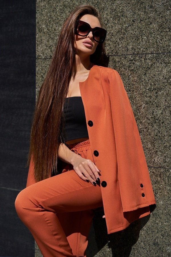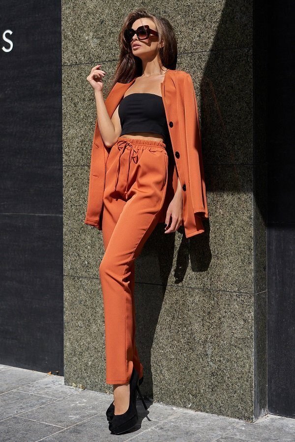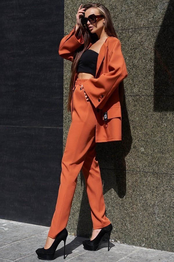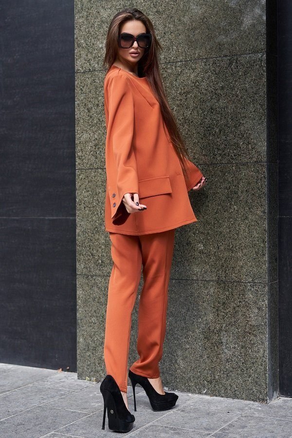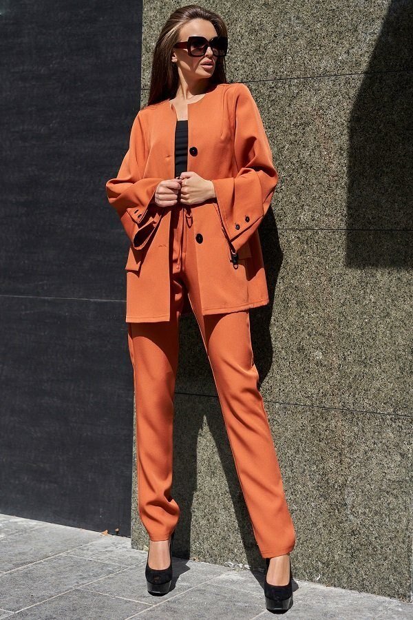Классический брючный костюм – двойка на основе двубортного жакета и брюк прямого кроя – по праву считается самым практичным и изысканным предметом женского гардероба. Элегантная модель брючного костюма прекрасно послужит для составления модных уличных луков, практичных повседневных аутфитов и романтичных ансамблей. В зависимости от выбранного стиля, подбирается модель определенного формата, которая заметно преображает и влияет на восприятие Вашего образа. Изысканный крой жакета делает акценты на груди, талии, визуально стройнит. Практичные брюки с прорезными карманами на широкой резинке со шнурком – добавят Вашему образу стиля!