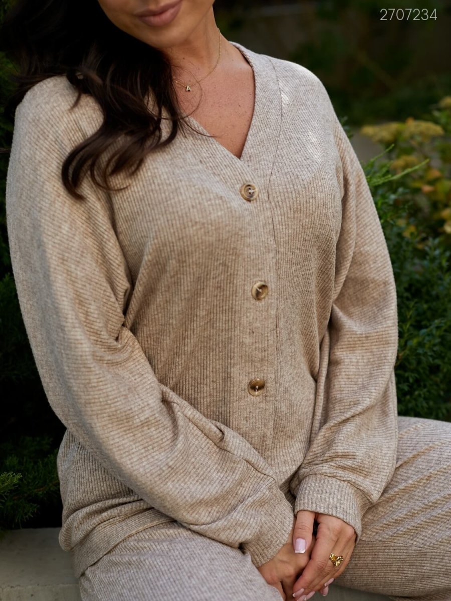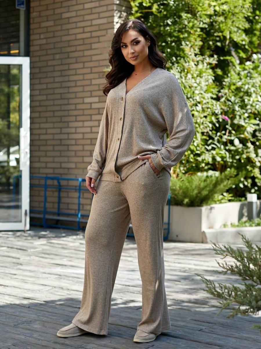 Подробности: кардиган свободного кроя с застежкой на пуговицах. Брюки-палаццо с поясом на широкой резинке с карманами в боковых швах.