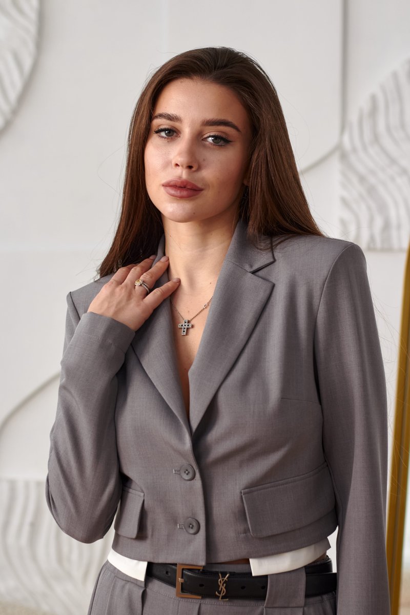 Элегантный костюм состоит из укороченного жакета и брюк палаццо. Жакет украшен имитацией карманов из белого коттона и застегивается на 2 пуговице. Брюки со стрелками по штанинам и резинкой по спине, что обеспечивает комфорт во время ношения. Этот костюм создаст стильный образ для любого события.