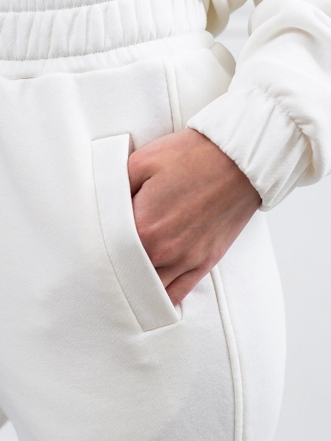 Джоггеры высокой посадки на манжетах с прорезиненным перестроченным поясом и карманами с листочками по бокам.