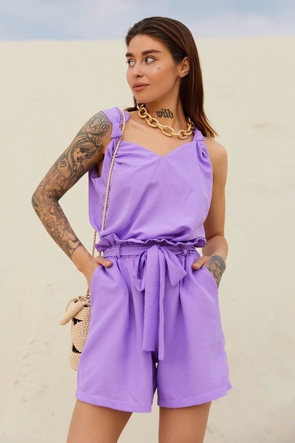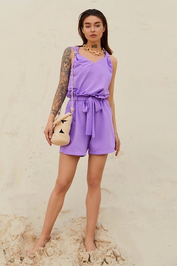 Трендом лета 2021 уже стали костюмы из лёгкого американского крепа. Топ на бретелях в виде декоративных узлов придадут образу стиля. Свободный силуэт топа придаст движениях свободы и раскованности. V-образный вырез позволит подернуть линию декольте. Шорты на высокой посадке свободного силуэта прибавят трендовости.