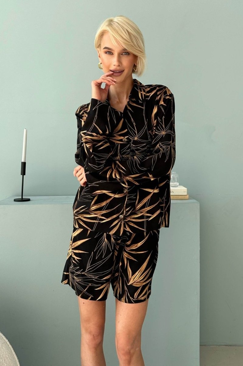 Яркий летний костюм из принтованного льна. Прекрасный выбор на жаркое лето. Комплект с топом, шортами и рубашкой. Рубашка свободного кроя с отложным воротником и застежкой на пуговицы. Короткие шорты с высокой посадкой и боковыми карманами. Эластичная вставка на поясе обеспечивает комфортную посадку.