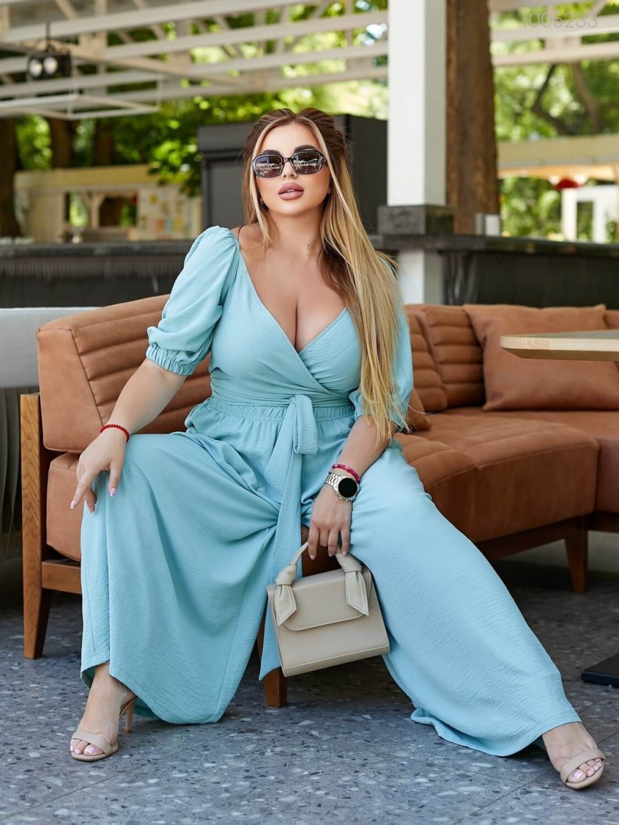 Подробности: топ с удлиненными пышными рукавами, глубоким декольте, длинными завязками вокруг талии. Роскошные юбка с косыми карманами и поясом на резинке.