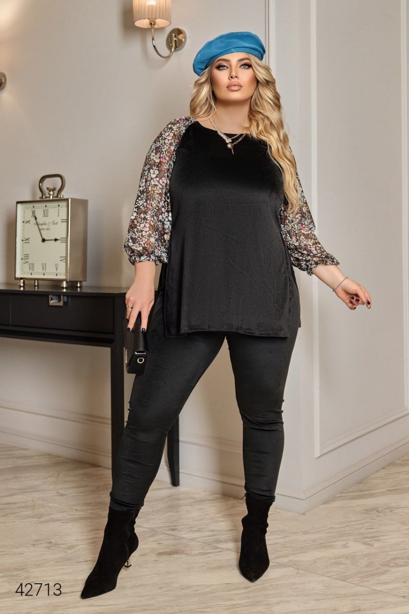 Костюм женский с лосинами. Мягкая, приятная на ощупь ткань хорошей растяжимости. Рукава – шифон. По бокам разрезы. Лосины высокой посадки, пояс на резинке.