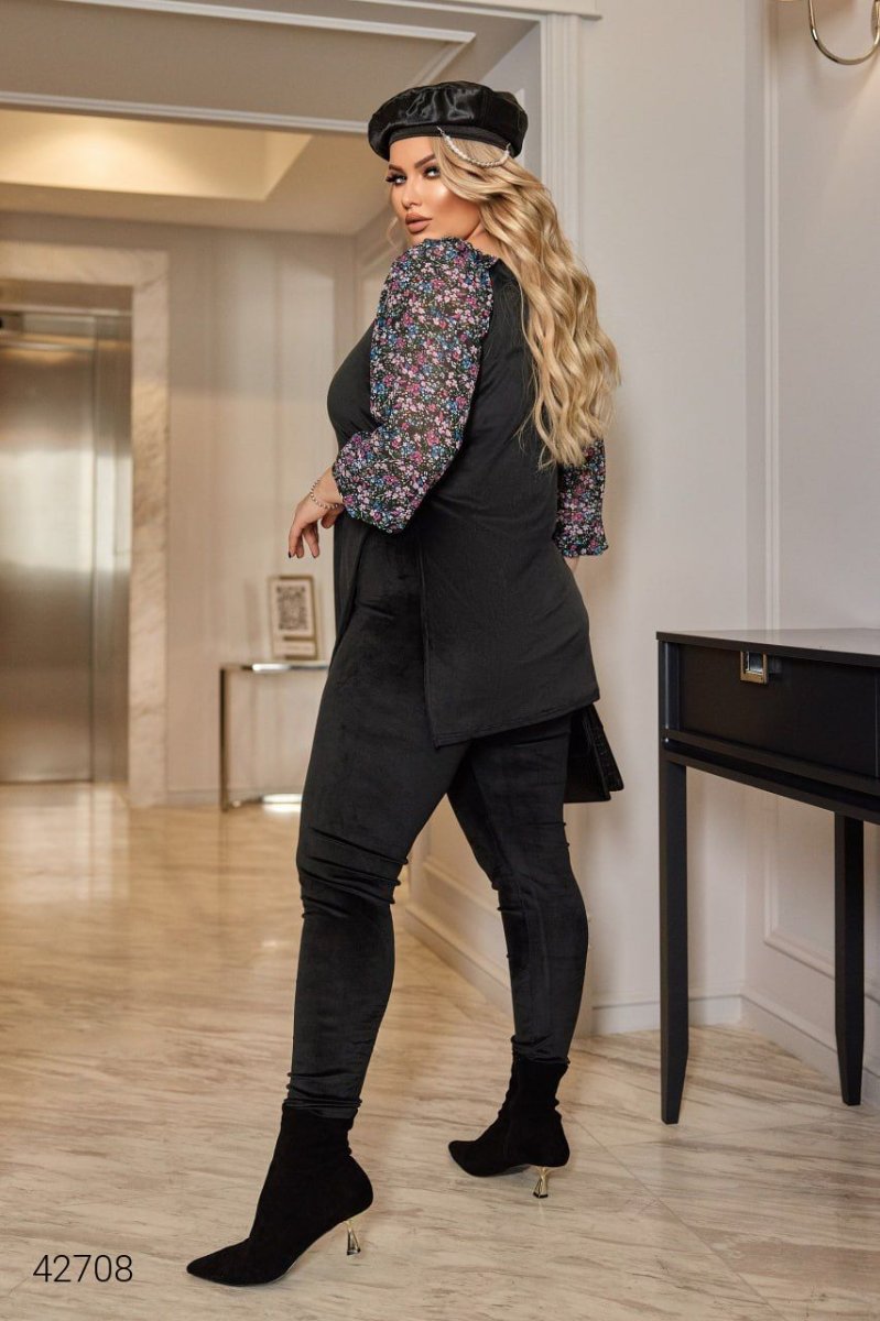 Костюм женский с лосинами. Мягкая, приятная на ощупь ткань хорошей растяжимости. Рукава – шифон. По бокам разрезы. Лосины высокой посадки, пояс на резинке.