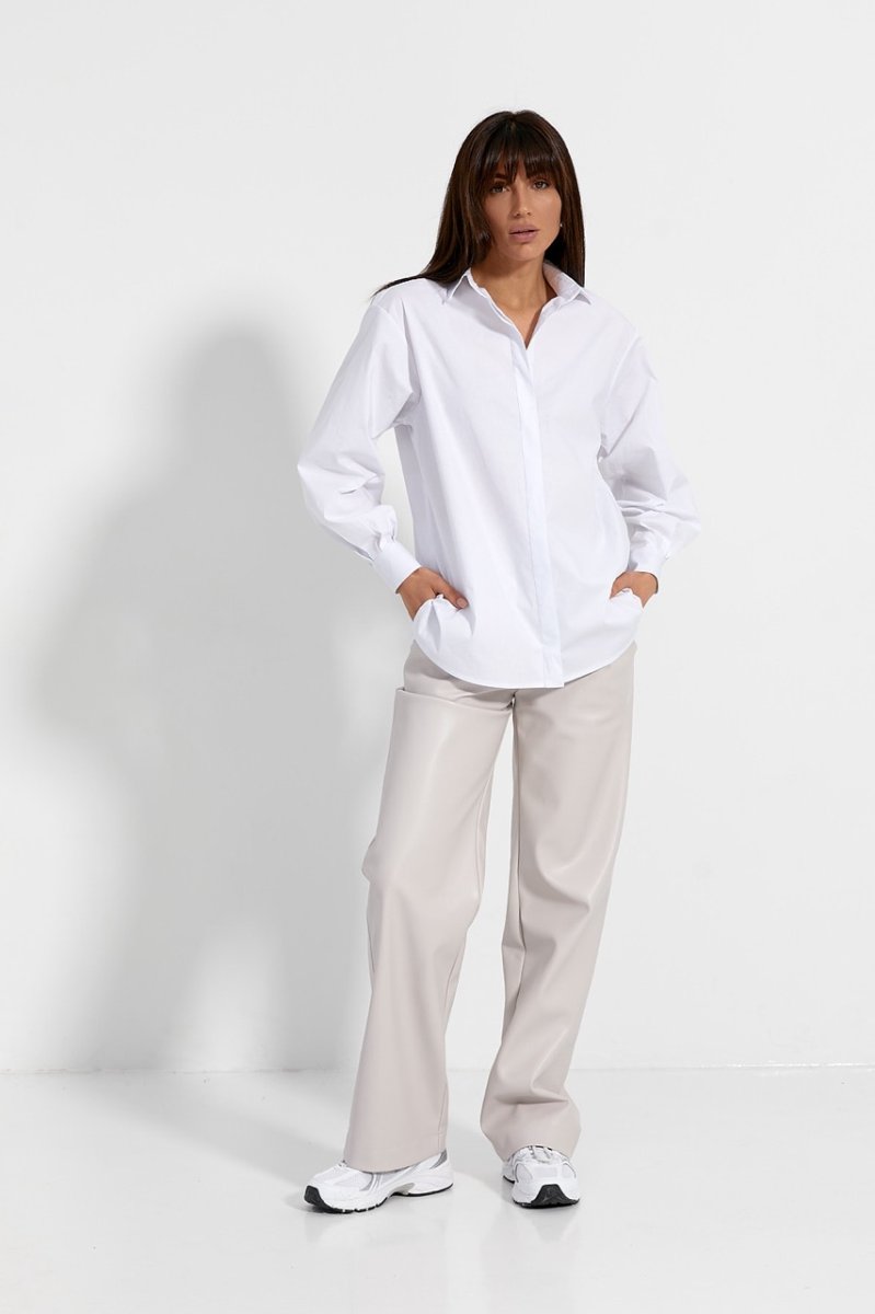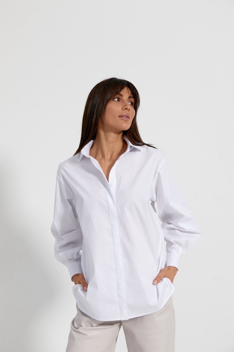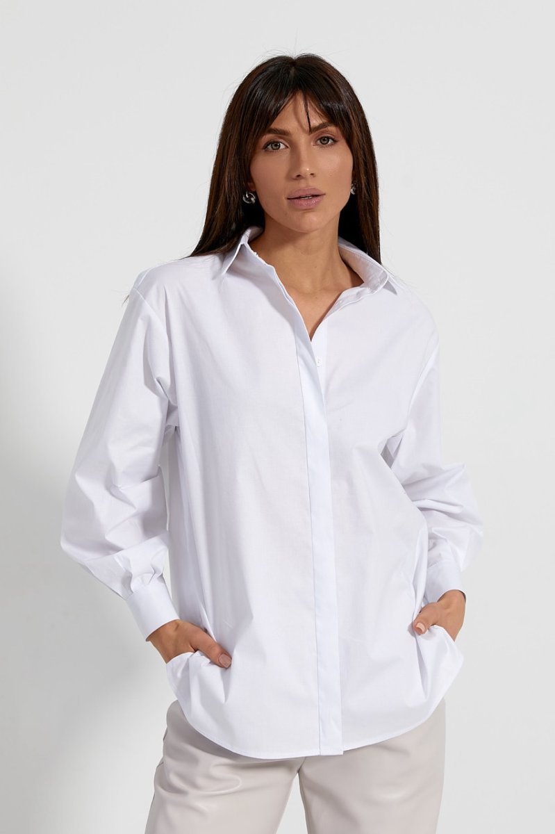 Котоновая рубашка со складками на рукавах и приспущенной линией плеча. Воротник рубашечного типа. Застежка рубашки спереди: скрытая. Спинка с кокеткой и складкой. Рукава вшивные, длинные, по низу манжет, застежка пуговица. В боковых швах: разрез. Отделочная строчка проложена по кокетке спинки, по низу и на манжетах рукава.