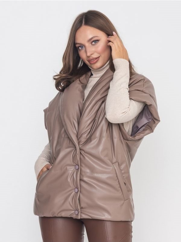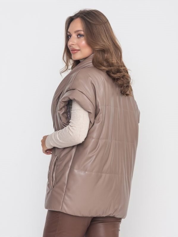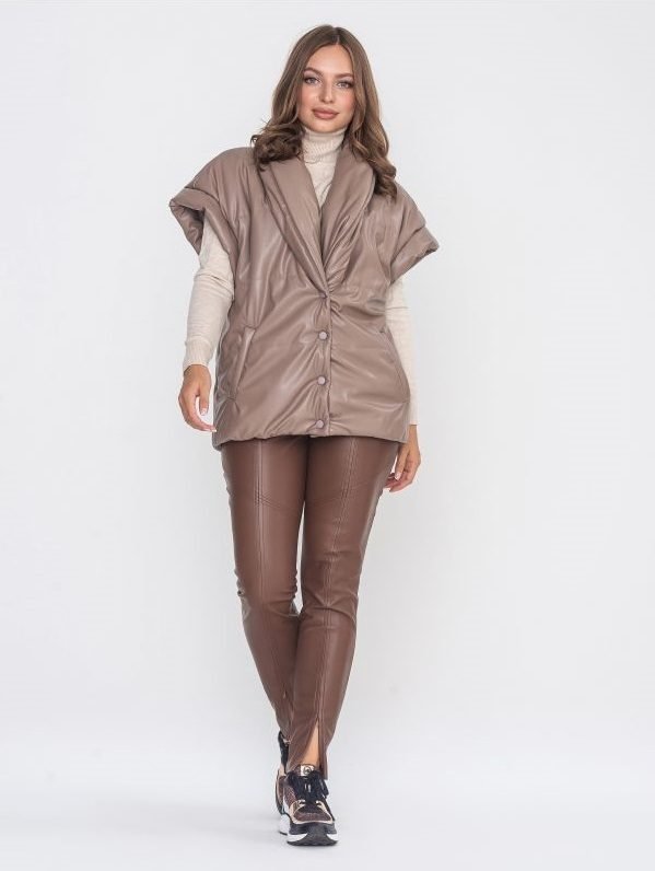 Красивый, стильный и теплый кожаный жилет на синтепухе. Застегивается на кнопки, дополнен утепленным шалевидным воротником. По бокам косые карманы с листочками. Съемный пояс из основного материала в комплекте.