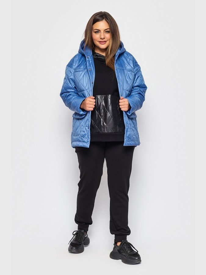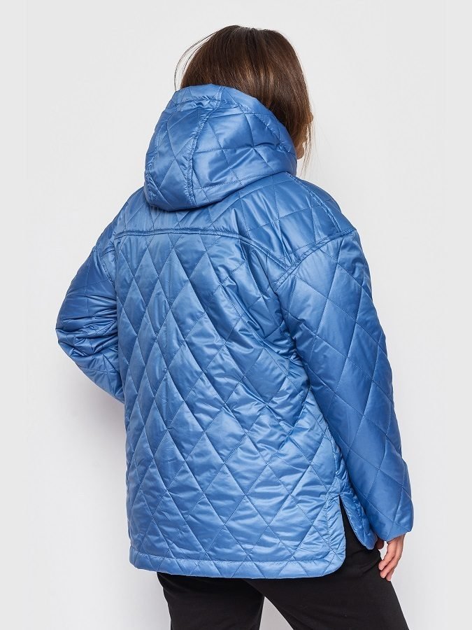 Утепленная куртка свободного кроя с капюшоном. Модель застегивается на кнопки, окрашенные в тон основного материала. Вверху прорезные карманы, внизу карманы с клапанами. Спинка слегка удлинена, по боковым швам разрезы.