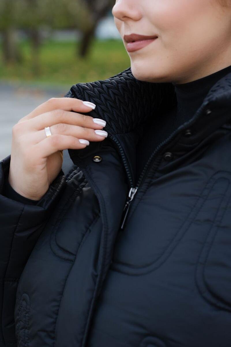 Изюминкой куртки является украшенный воротник и планки на карманах трендовой стежкой колосок.