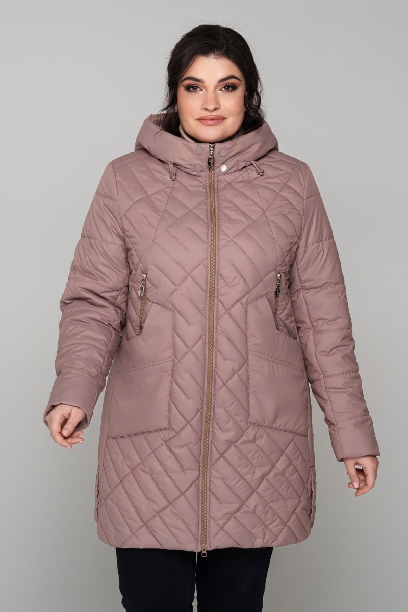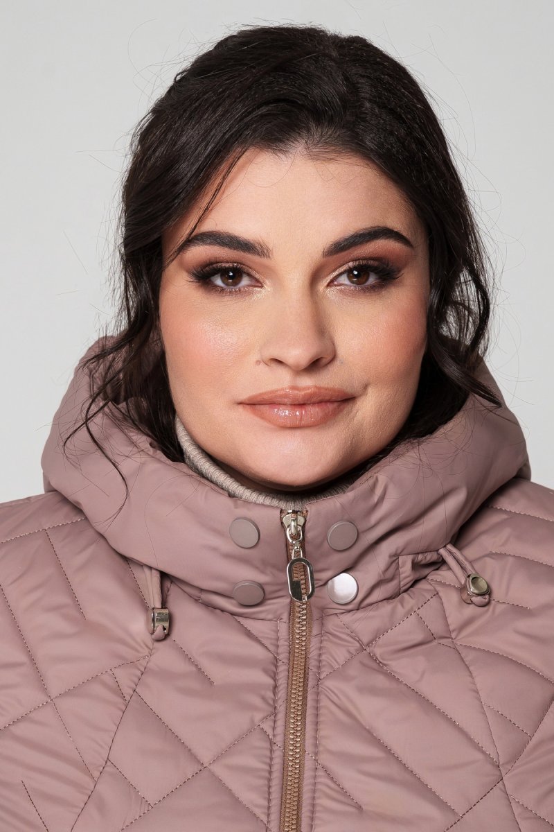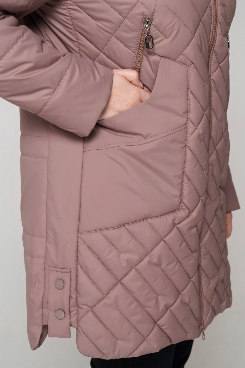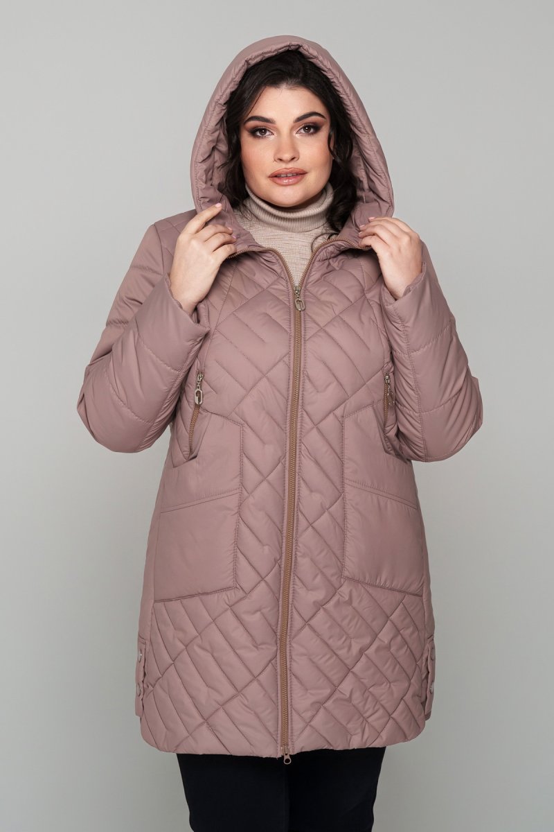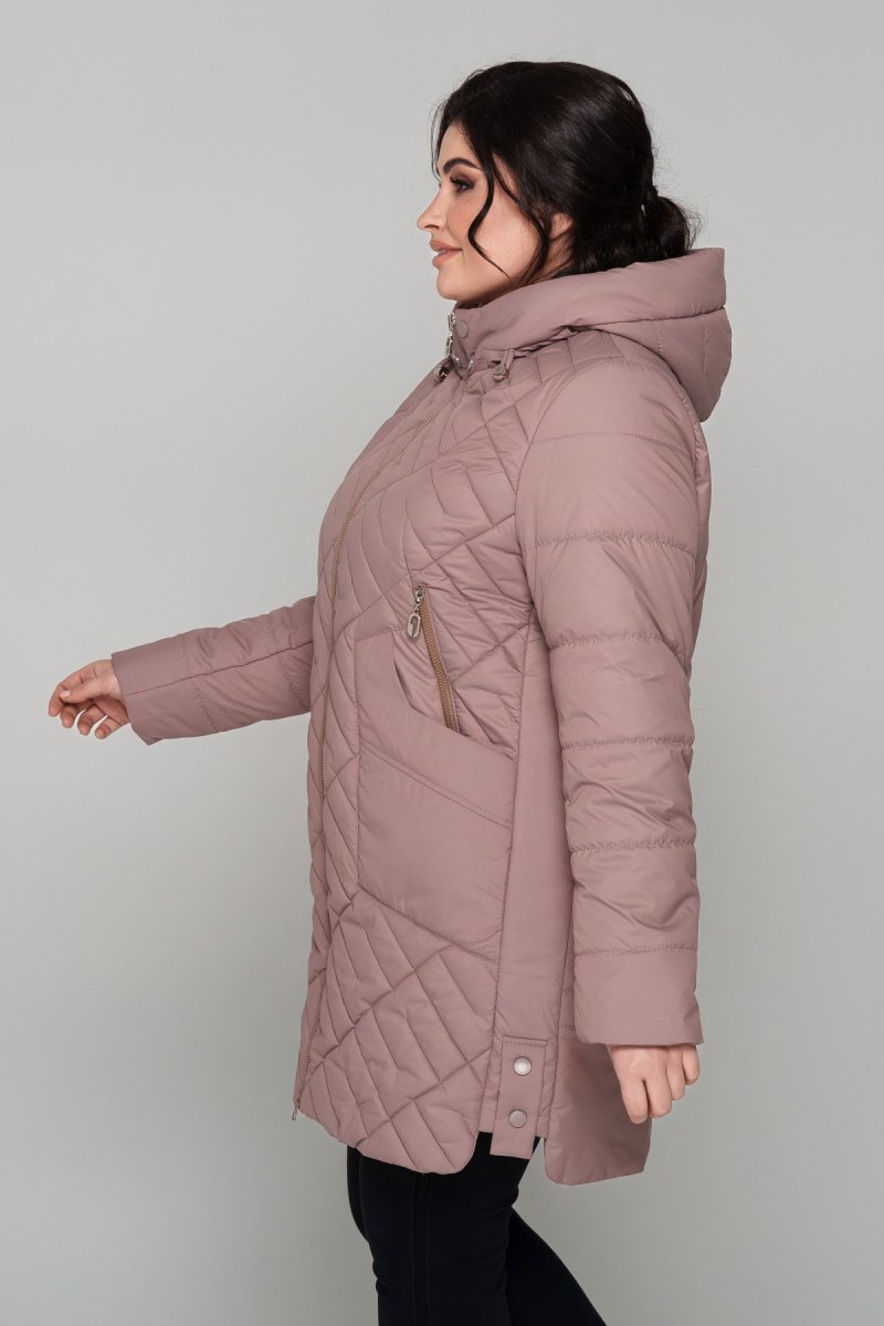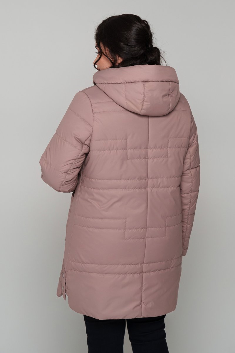 Куртка прямого силуэта, наполнитель тинсулейт (120 г/м2). Рукав втачный, двухшовный. В рельефных швах полки карман на молнию, а также фигурный накладной карман. По бокам расположен пат, декорированный кнопками. Капюшон втачный, высота регулируется шнурком с зажимами, декорирована четырьмя кнопками. Застежка на двустороннюю молнию. Подкладка: нейлон.