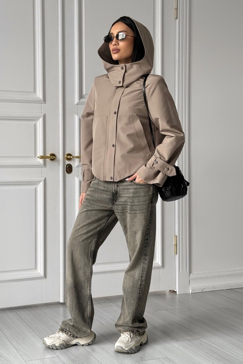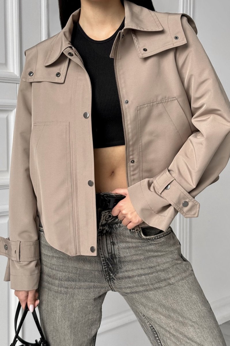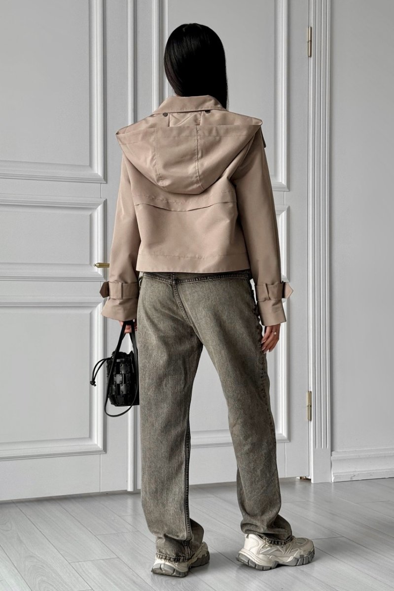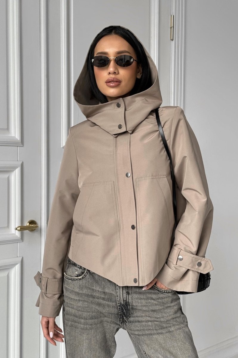 Укороченная куртка прямого кроя, изготовленная из качественной водоотталкивающей ткани. Модель с классическим воротником и съемным капюшоном на кнопках с длинными рукавами с патами. По переду – два больших накладных кармана. Куртка застегивается на молнию и металлические кнопки. Модель на подкладке.