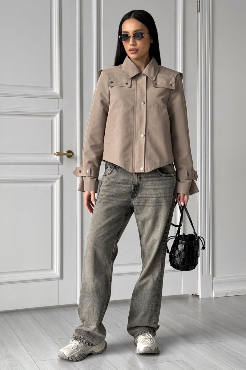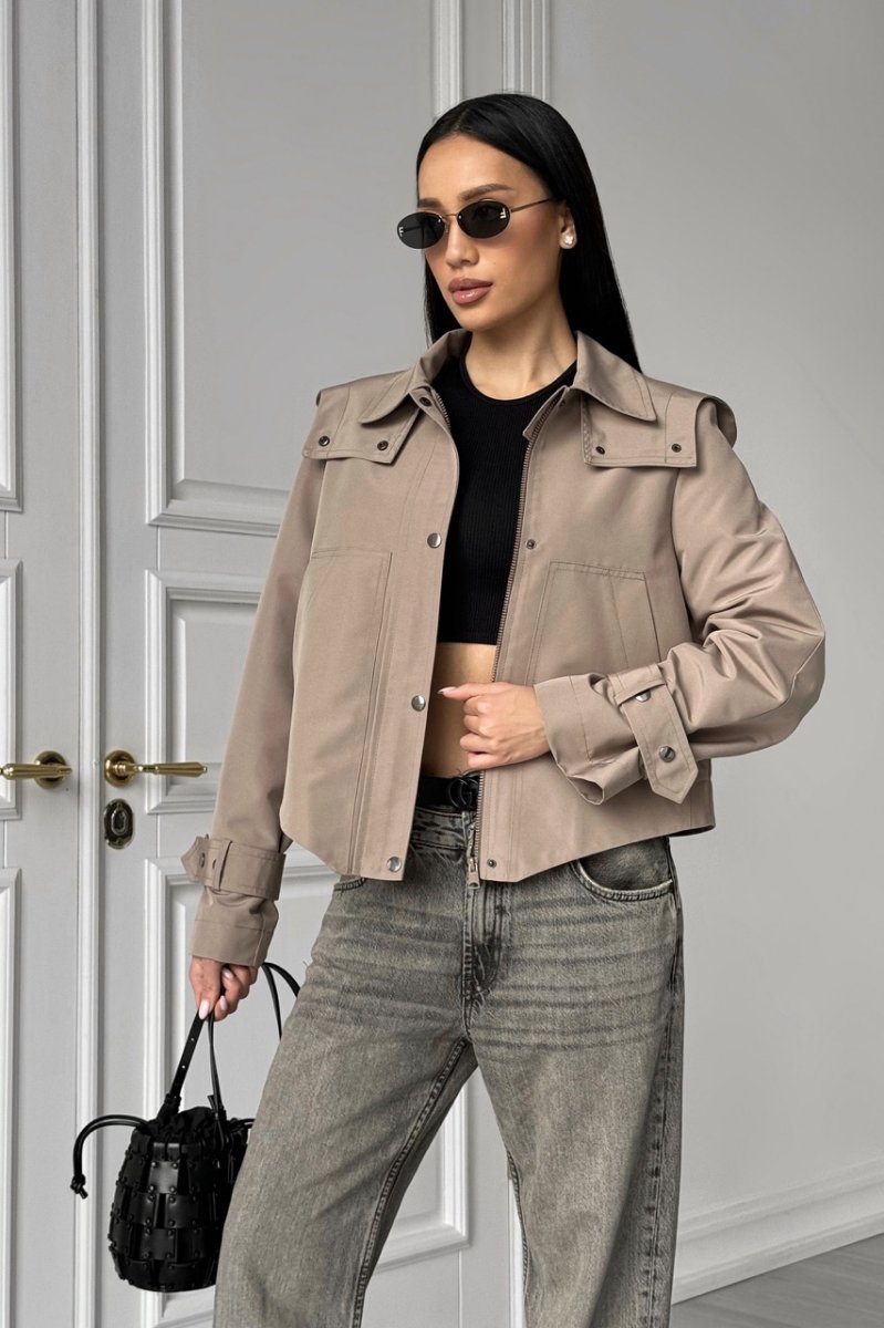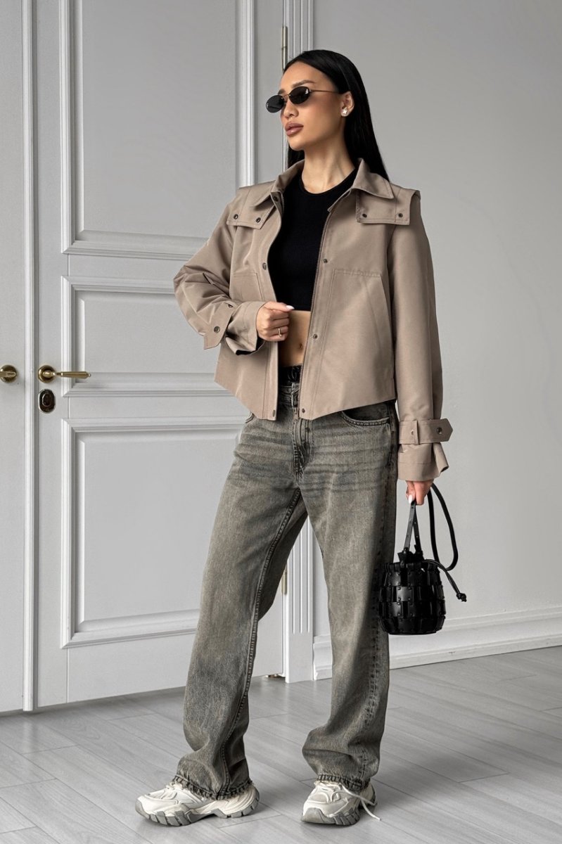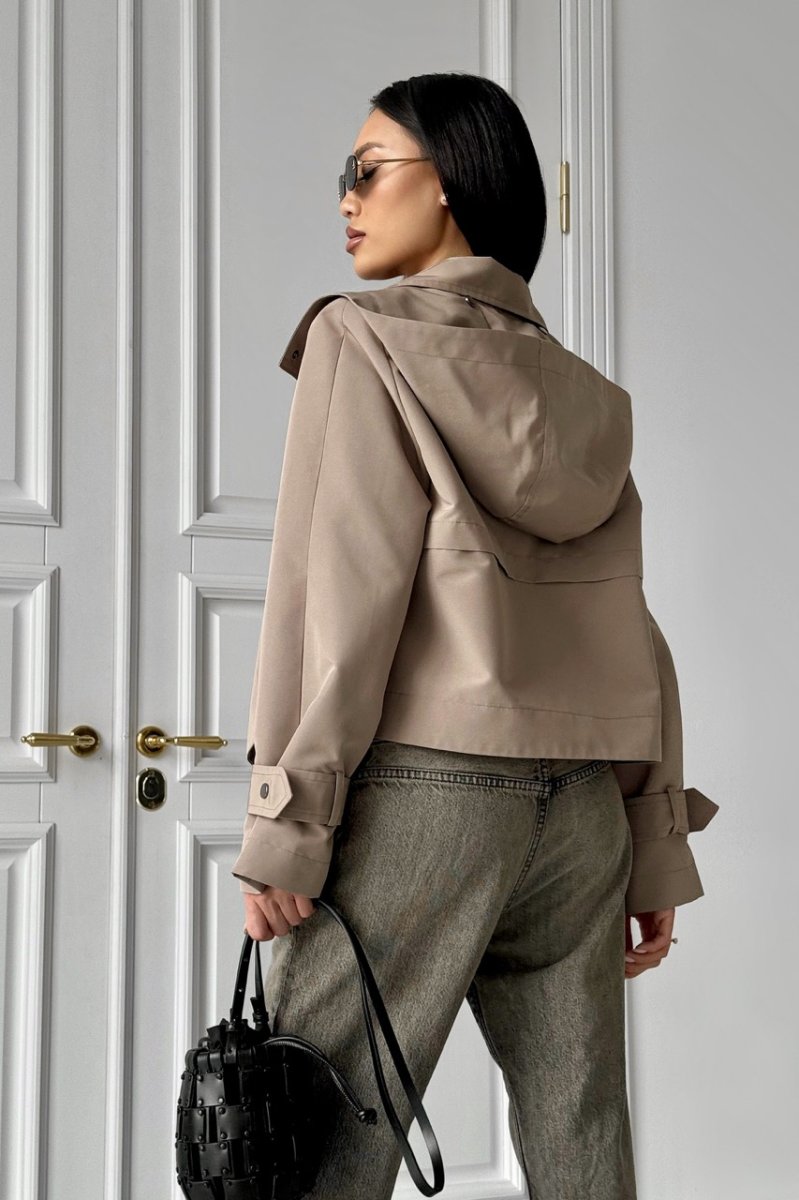Укороченная куртка прямого кроя, изготовленная из качественной водоотталкивающей ткани. Модель с классическим воротником и съемным капюшоном на кнопках с длинными рукавами с патами. По переду – два больших накладных кармана. Куртка застегивается на молнию и металлические кнопки. Модель на подкладке.