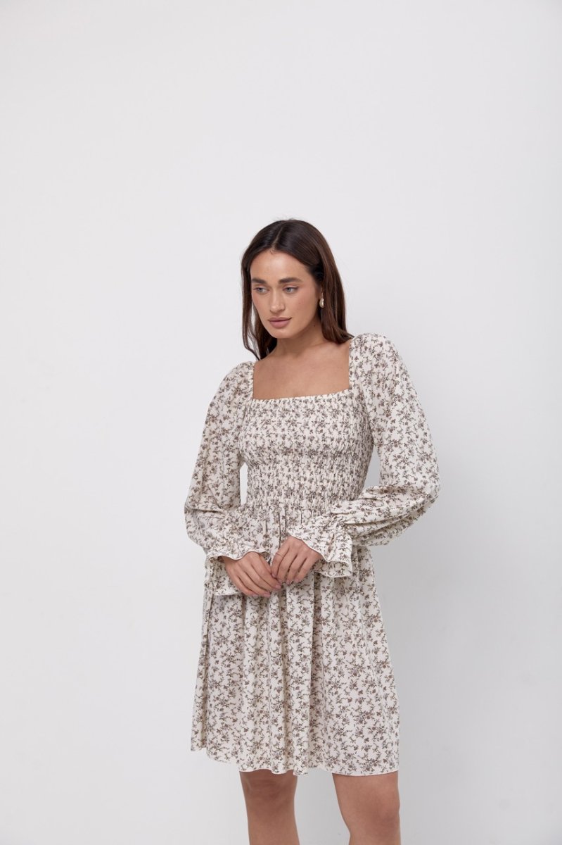 Легкое летнее платье длиной выше колен. Лиф собран резинкой по всей длине и ширине. Юбка собрана на талии. Рукава длинные, верхняя часть собрана резинкой и функционирует, как бритель. Низ рукава собран с образованием рюши. Резинка для волос в комплекте