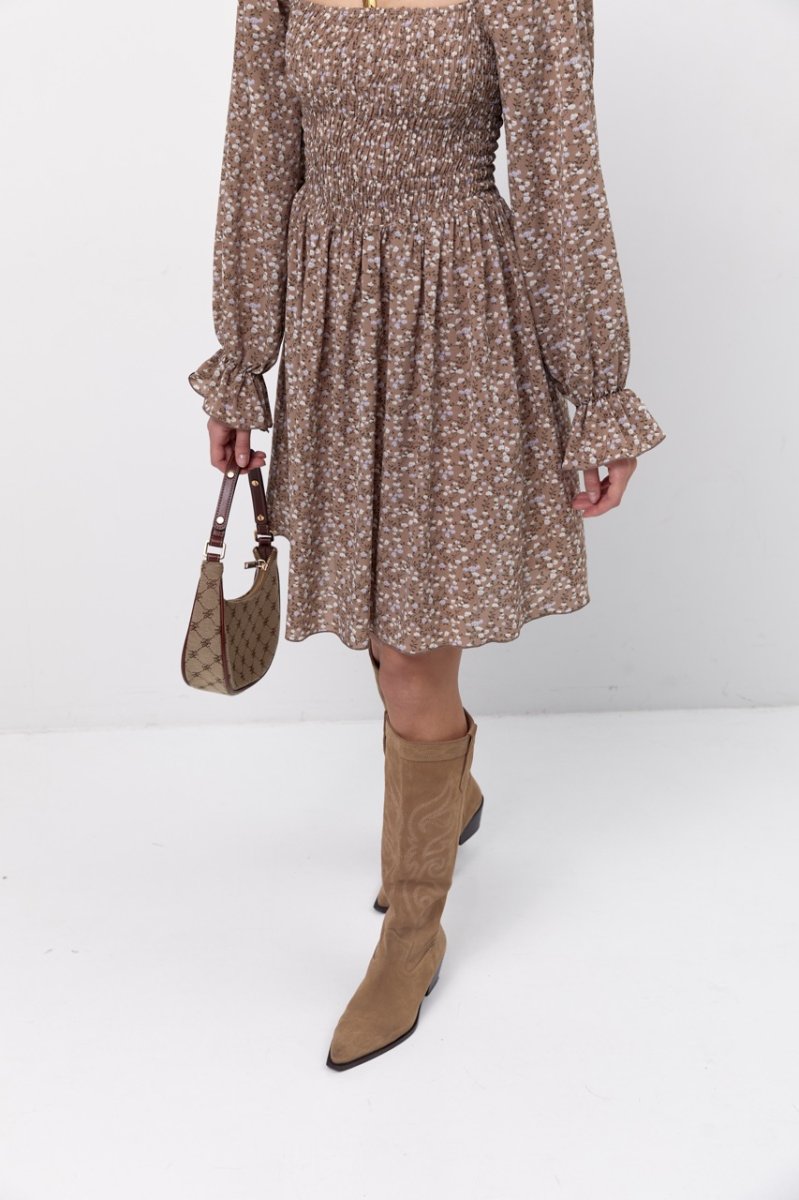 Легкое летнее платье длиной выше колен. Лиф собран резинкой по всей длине и ширине. Юбка собрана на талии. Рукава длинные, верхняя часть собрана резинкой и функционирует, как бритель. Низ рукава собран с образованием рюши. Резинка для волос в комплекте