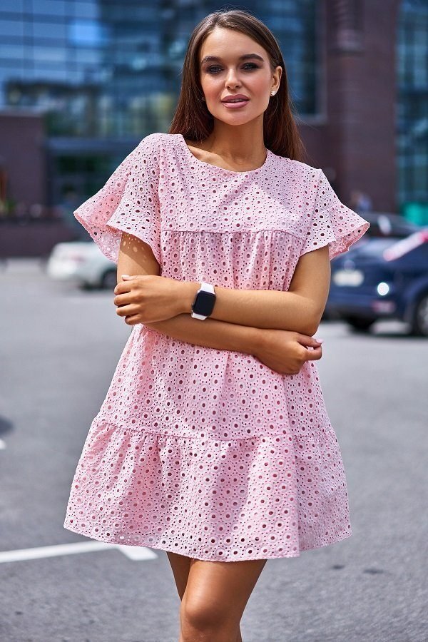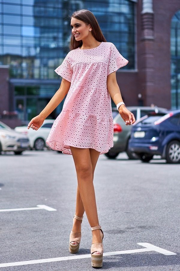 Легкое платье мини из прошвы отлично подходит для повседневной носки. Поэтому наслаждаться практичностью и удобством наряда, даже когда на улице +40, можно хоть каждый день. Также одеяние идеально для посиделок в кафе на берегу моря и прогулок по извилистым улочкам курортных городов. Трапециевидная форма платья добавляет образу кокетливости и игривости.