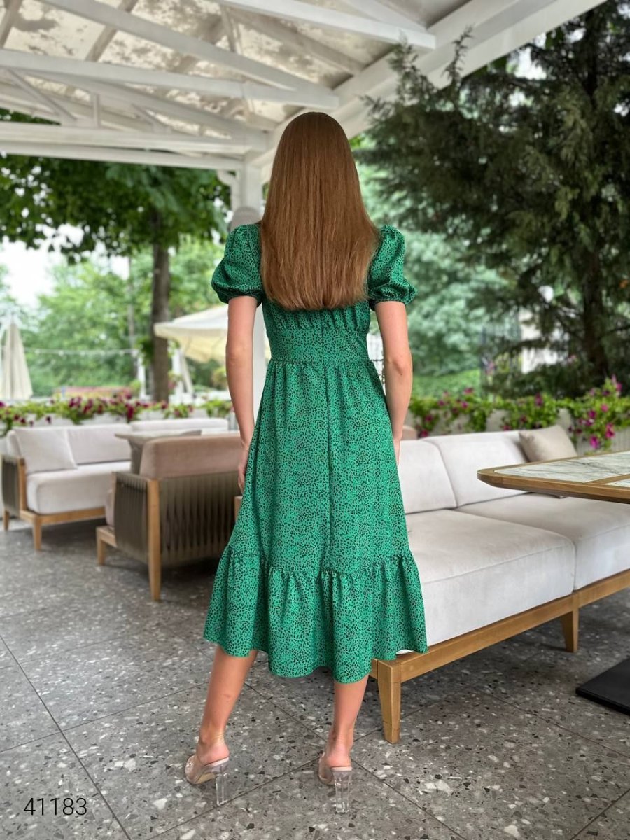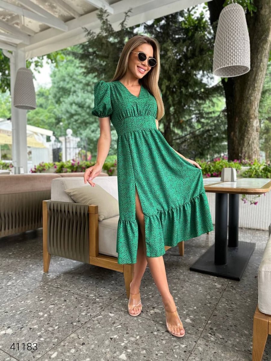 Летнее платье. На спине потайная молния. Рукава на резинке. На юбке боковые разрезы. Ткань: турецкий софт.