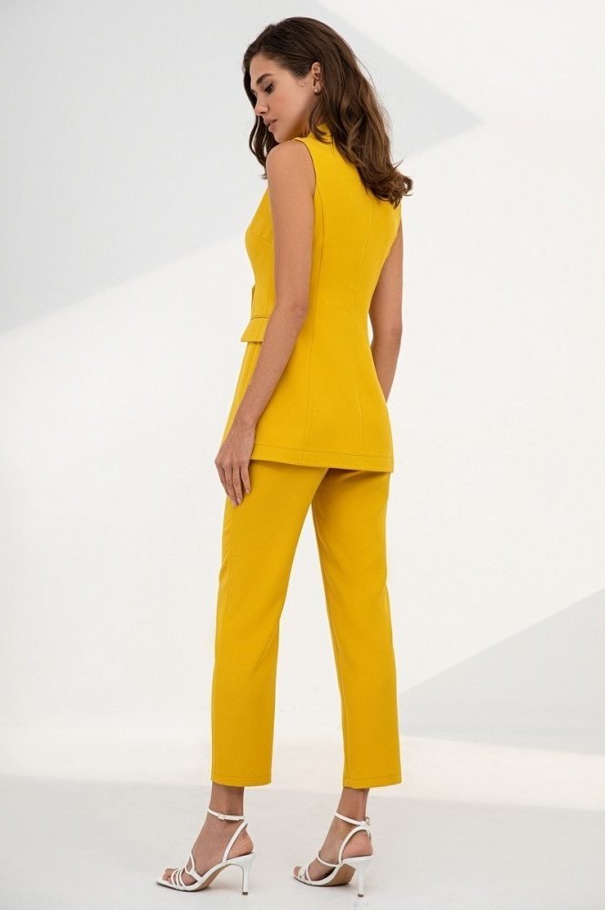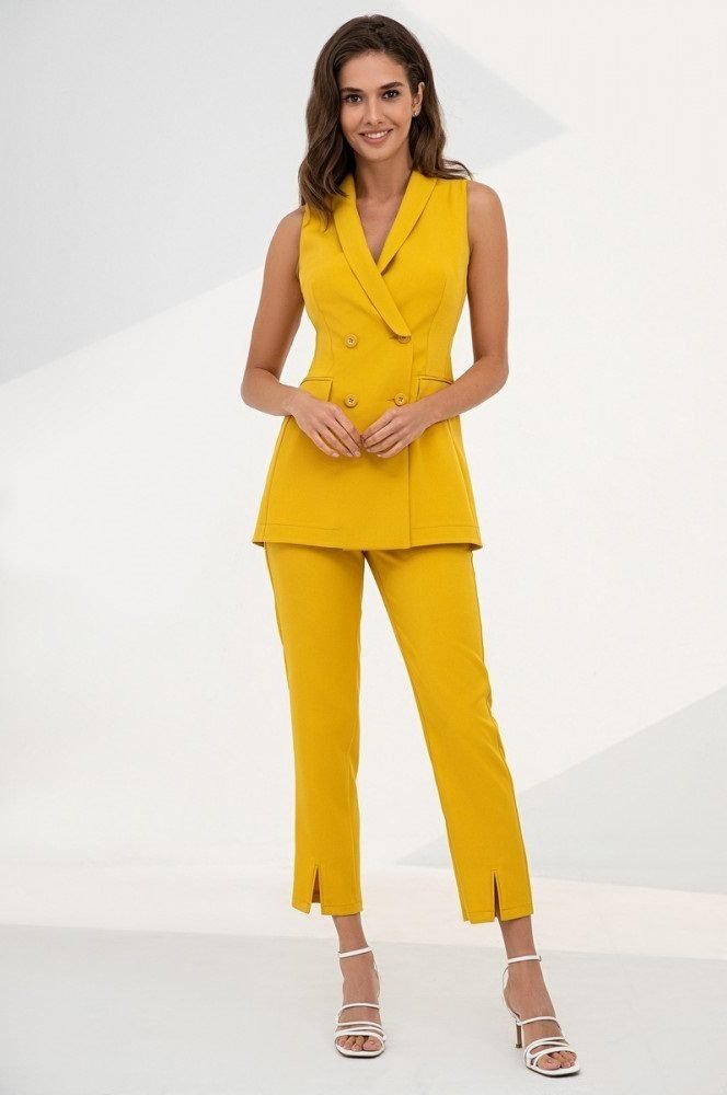 Летний костюм состоящий из удлиненного жилета и брюк с высокой талией. Брюки с небольшими разрезами на брючине, застегиваются на молнию и пуговицу. Жилет без подкладки. С помощью практичных комплектов с жилетом создаются броские и яркие женские образы, шикарные романтичные и прогулочные луки, практичные уличные и молодежные ансамбли.