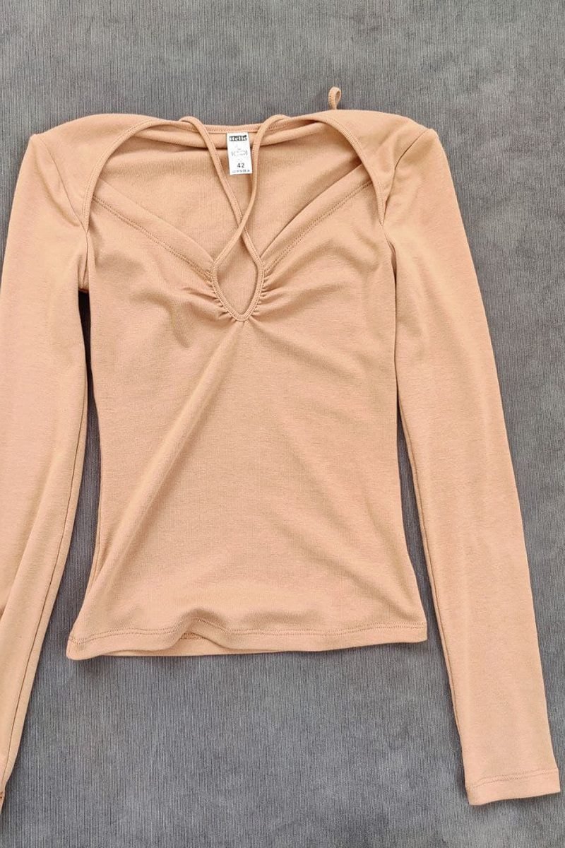 Лонгслив облегающего кроя с длинным рукавом и с завязкой на шее. Изюминкой модели является вырез в виде капли. Лонгслив удачно дополнит яркий наряд в повседневный образ.