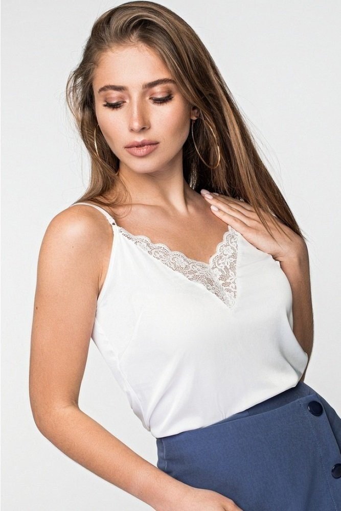 Шелковая майка с кружевом. Бретели регулируются. Длина по спинке (прибл.) – 55 см.