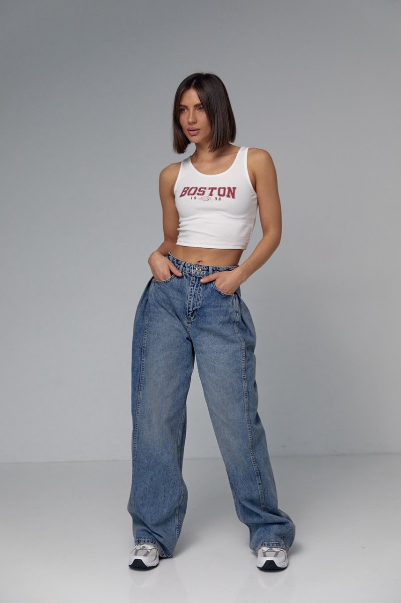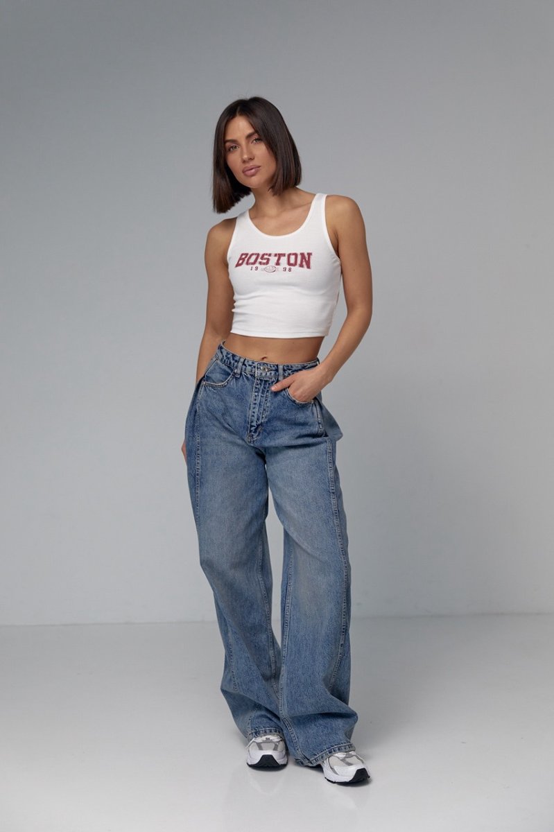 Принт в виде надписи Boston, который спереди украшает изделие, станет изюминкой твоего наряда. В модели края низа прямые, круглая горловина и проймы обшиты тонкой окантовкой.