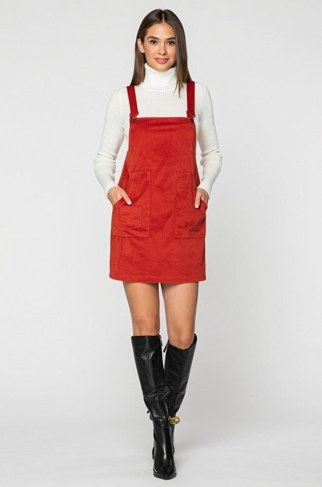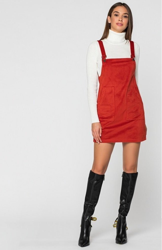 Модный сарафан из вельвета прямого кроя на широких регулируемых бретелях.