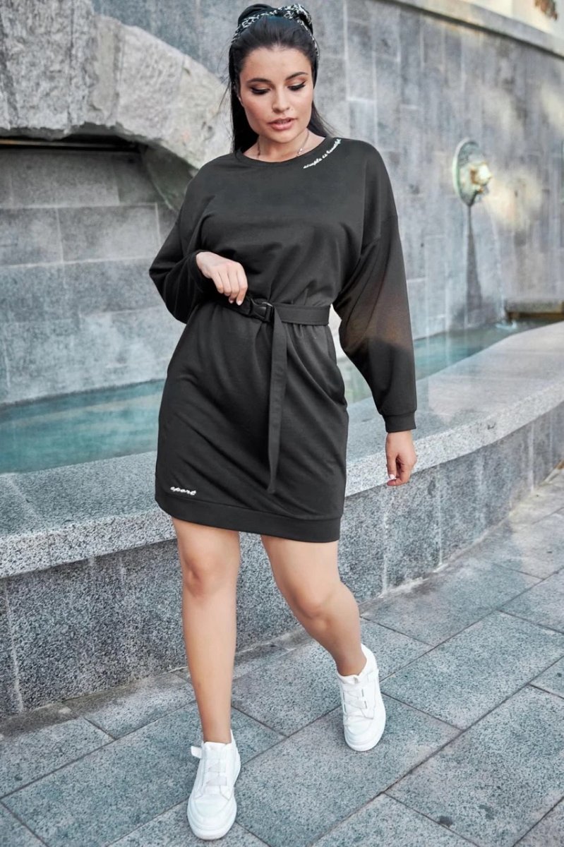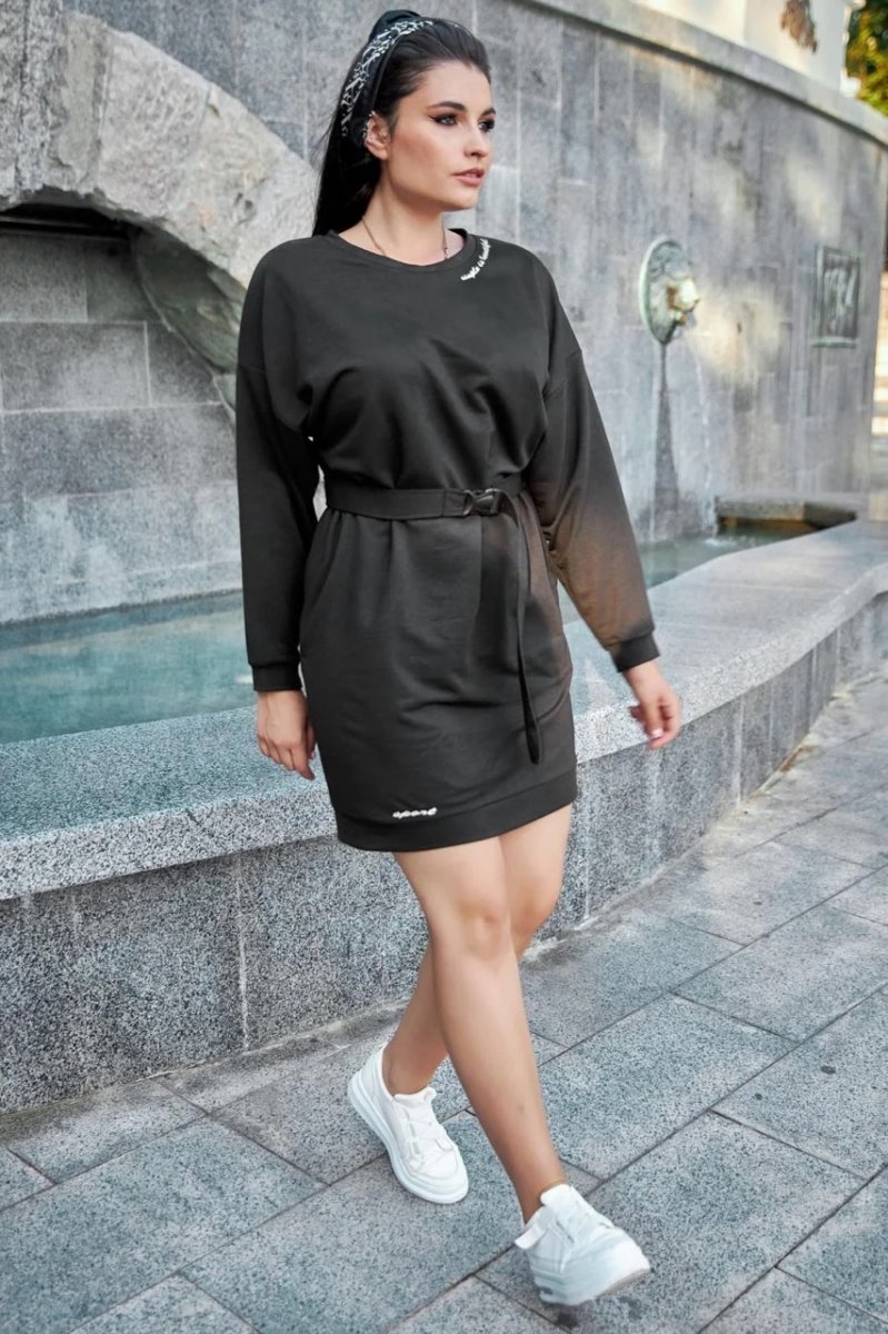 Молодежное платье со свободным, зауженным к низу фасоном. Подчеркнуть линию талии помогает съемный текстильный пояс с пряжкой. По низу платья идет манжета, а сбоку расположены удобные карманы. Модель украшена вышивкой и имеет стильные длинные приспущенные рукава.