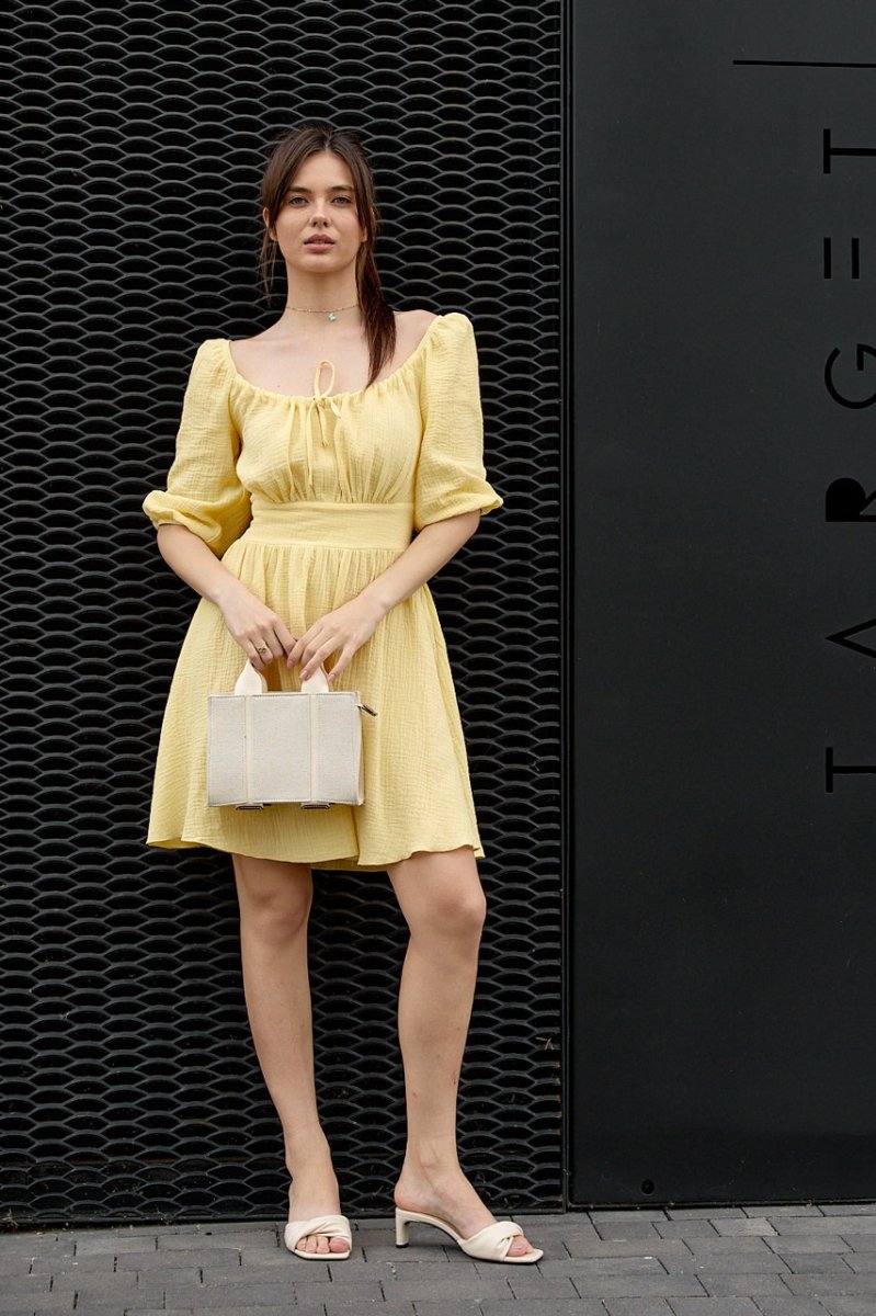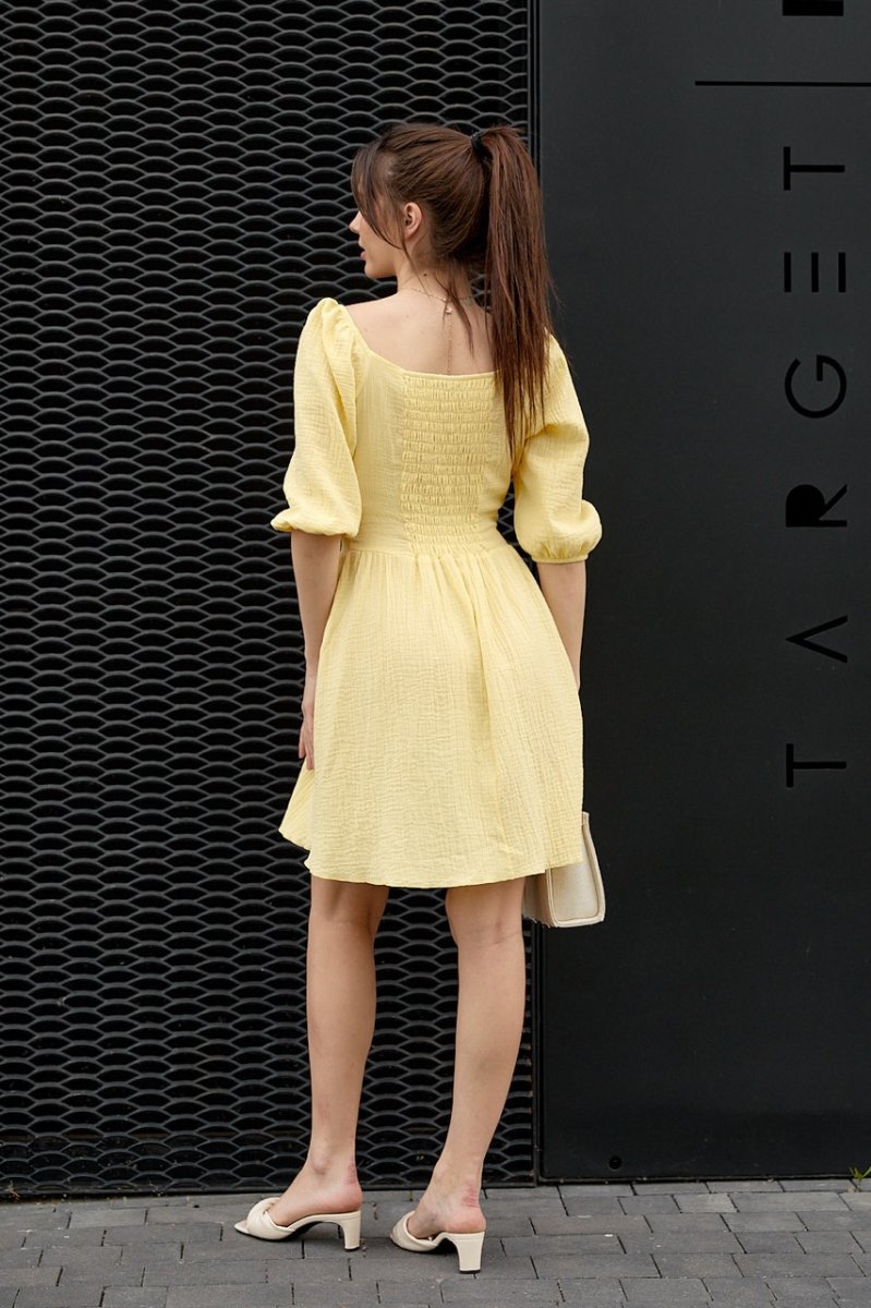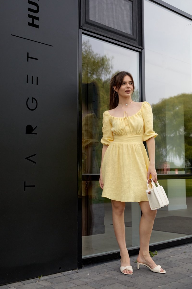 Муслиновое платье мини. Передняя часть платья собрана кулиской, что создает волшебный эффект. Сборка под линией груди придает особый шарм этому платью. На талии вы видите пришивной пояс. Юбка платья имеет классический клеш-крой и собрана по талии. Центральная часть спинки с резинкой обеспечивает комфортную посадку. Уникальная особенность этого платья в рукавах, которые могут использоваться в качестве бретелей. Низ рукава собран резинкой.