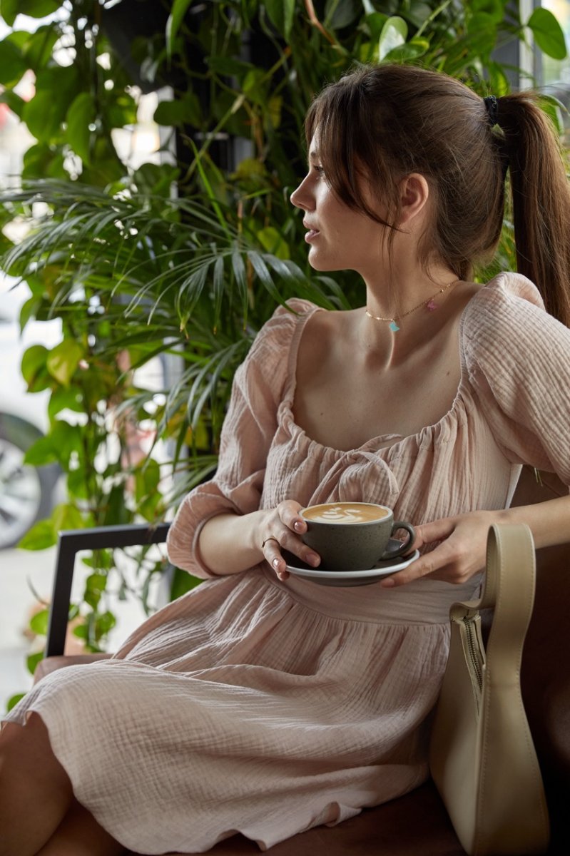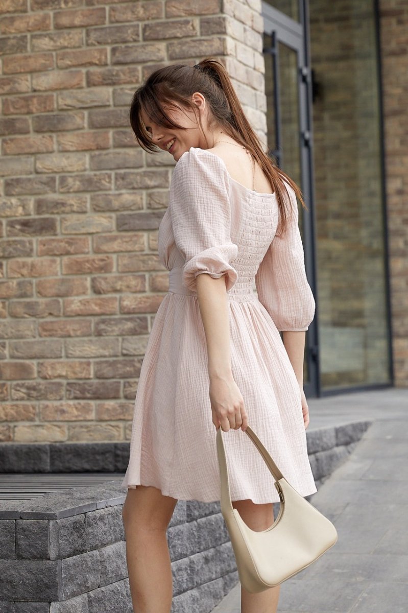Муслиновое платье мини. Передняя часть платья собрана кулиской, что создает волшебный эффект. Сборка под линией груди придает особый шарм этому платью. На талии вы видите пришивной пояс. Юбка платья имеет классический клеш-крой и собрана по талии. Центральная часть спинки с резинкой обеспечивает комфортную посадку. Уникальная особенность этого платья в рукавах, которые могут использоваться в качестве бретелей. Низ рукава собран резинкой.