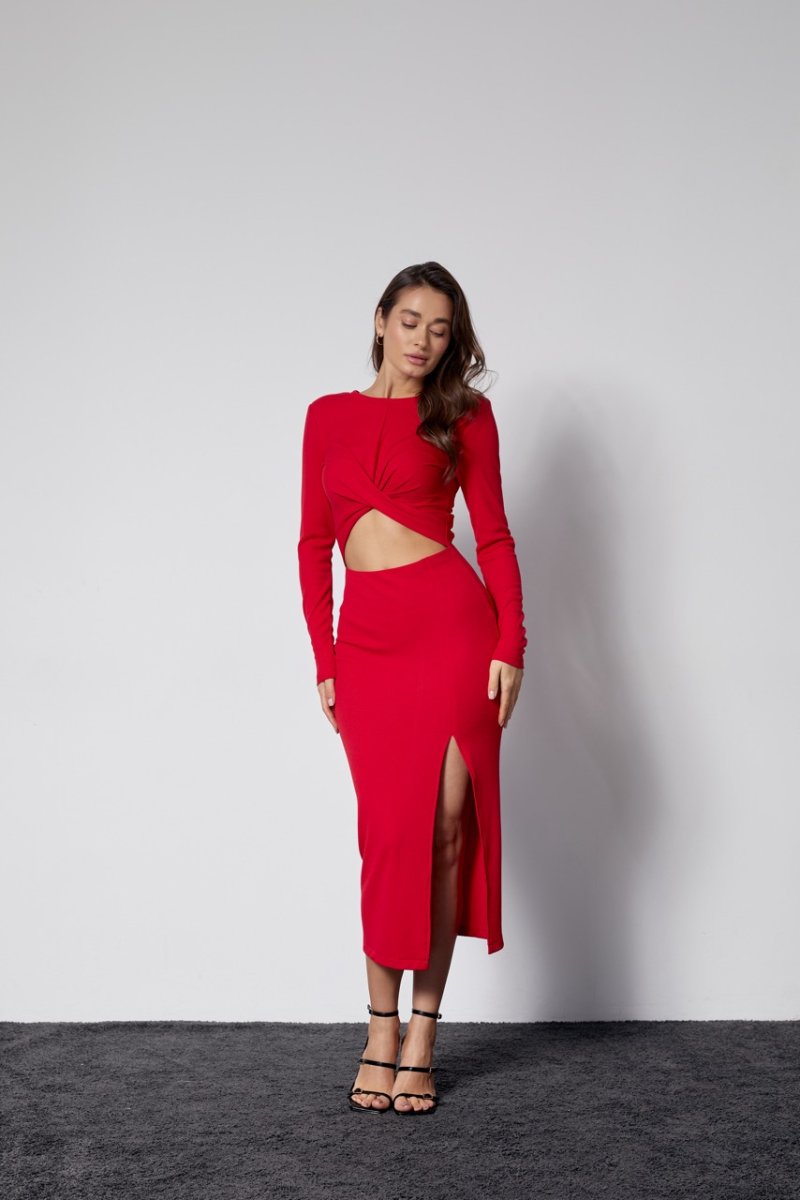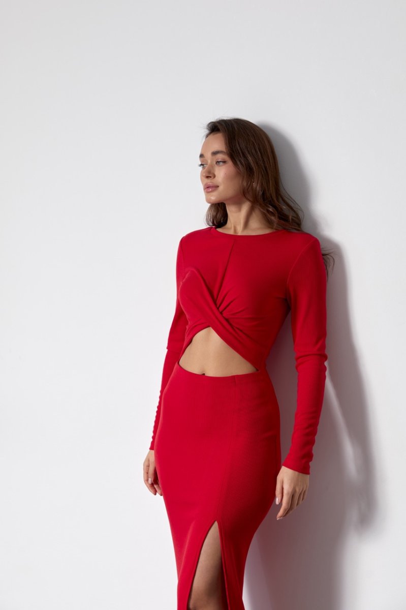 Нарядное платье с высоким разрезом на левой ноге. Вырез горловины круглый, с планочкой. Рукава длинные. На груди драпировка.