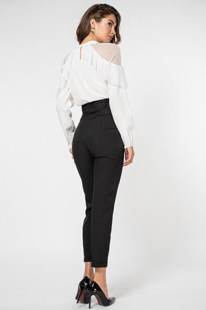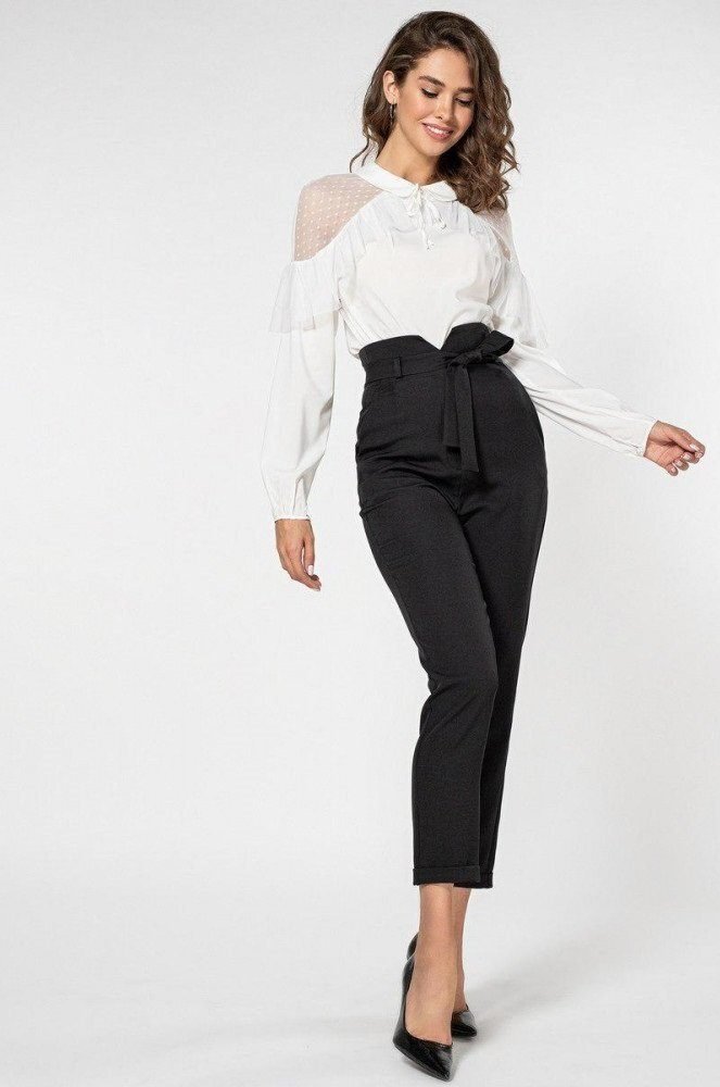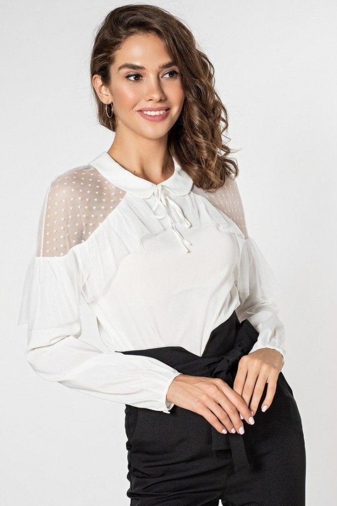 Нежная блуза с вставками из сетки в горох и фатиновой оборкой на плечах. Застёгивается на пуговицу сзади.