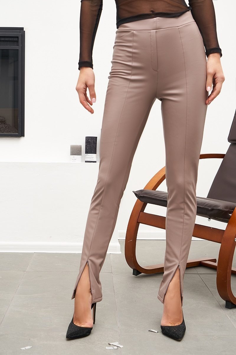 Облегающие леггинсы из эко-кожи с высокой посадкой. Изюминкой леггинсов являются разрезы внизу изделия, которые застегиваются на потайную молнию. А так же швы, которые идут по центру штанины. Леггинсы без застежек, на резинке.