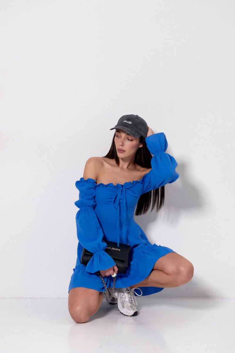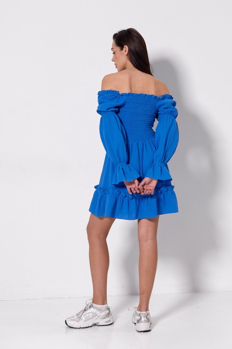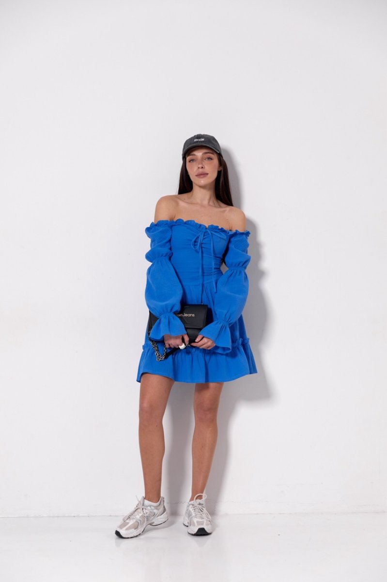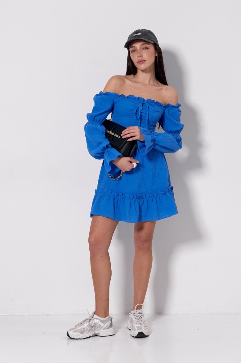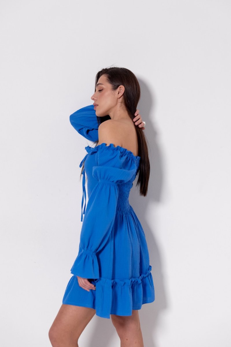 Однотонное муслиновое платье мини. Вырез горловины с рюшей. Спереди со сборкой на груди. Юбка – клеш, собранная на талии, по низу юбки рюша. Рукава длинные. По верху и по низу рукава резинка. Спинка собрана резинкой, гарантирующей прилегание.