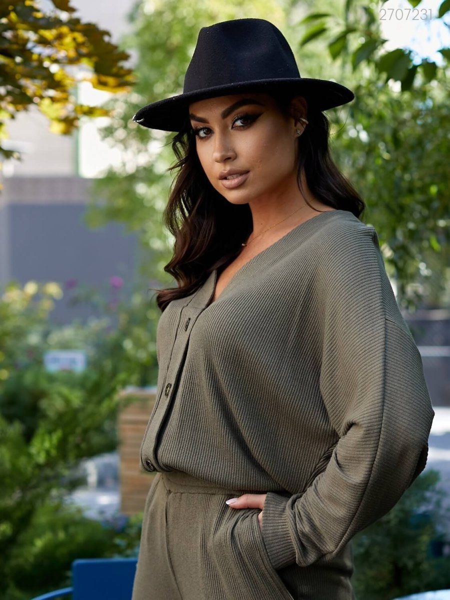 Подробности: кардиган свободного кроя с застежкой на пуговицах. Брюки-палаццо с поясом на широкой резинке с карманами в боковых швах.