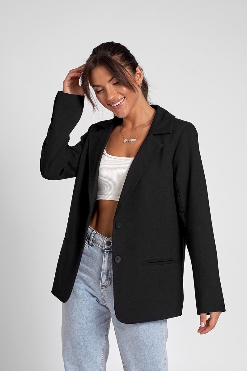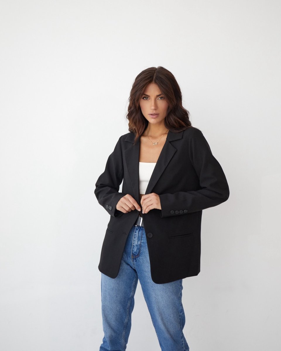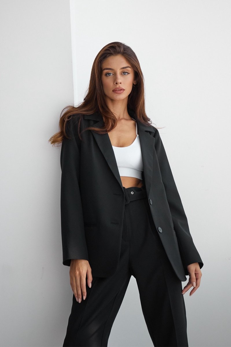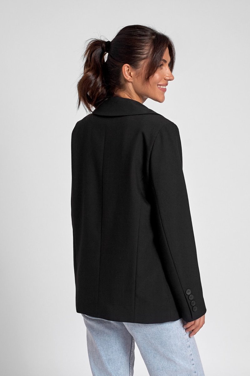 Пиджак на подкладке, длина ниже линии бедер. Рукава вшивные, длинные, двухшовные с пуговицами на имитированой шлицей. Карманы прорезные с обшивками. Воротник пиджачного типа, застегивается на пуговицы, низ края борта заокруглен.