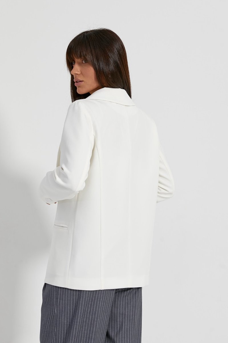 Пиджак на подкладке, длина ниже линии бедер. Рукава вшивные, длинные, двухшовные с пуговицами на имитированой шлицей. Карманы прорезные с обшивками. Воротник пиджачного типа, застегивается на пуговицы, низ края борта заокруглен.