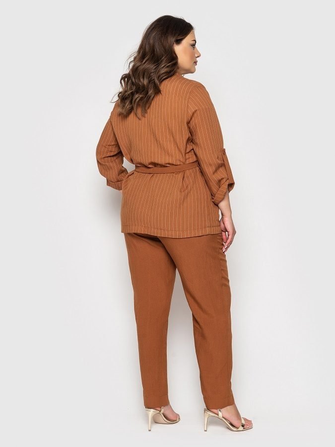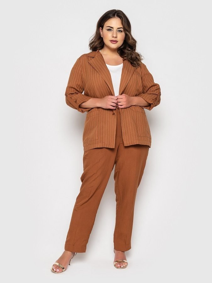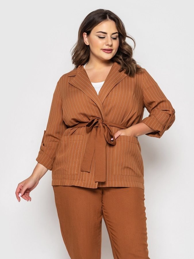Пиджак в вертикальную полоску зрительно делает силуэт стройнее. Крой свободный. Рукава длинные, модернизируются в 3/4 при помощи хлястика и пуговицы. Накладные карманы по бокам.