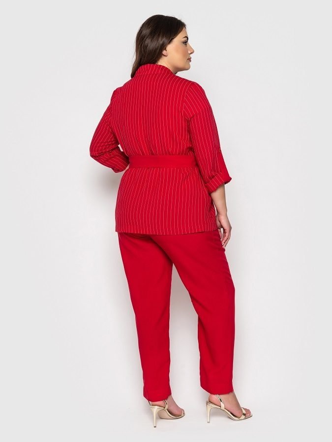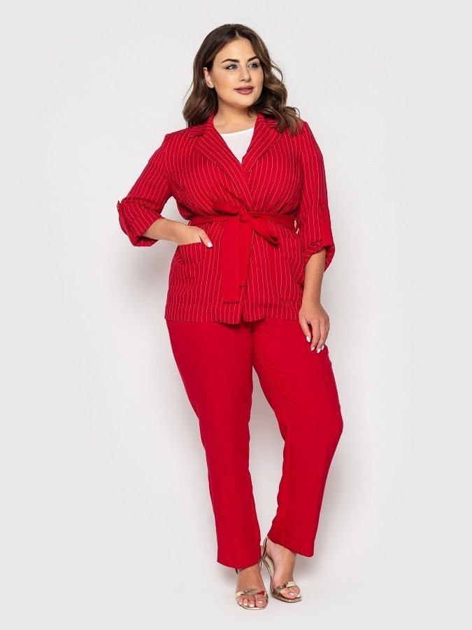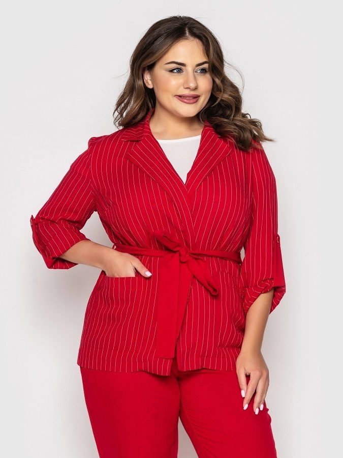 Пиджак в вертикальную полоску зрительно делает силуэт стройнее. Крой свободный. Рукава длинные, модернизируются в 3/4 при помощи хлястика и пуговицы. Накладные карманы по бокам.