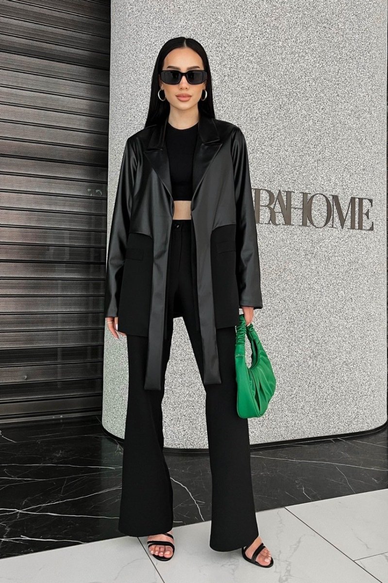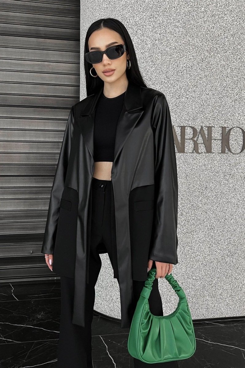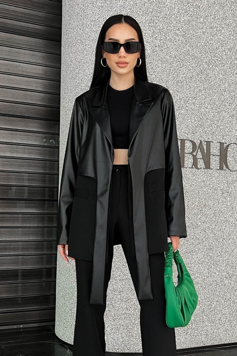 Прямой жакет с выделенной линией плеча и застежкой на один потаенный крючок – стильная модель, которой легко подобрать пару. Ярким акцентом является имитация летних кокеток по переду и спинке. Модель выполнена из эко-кожи и креп-костюмки, модель на подкладке.