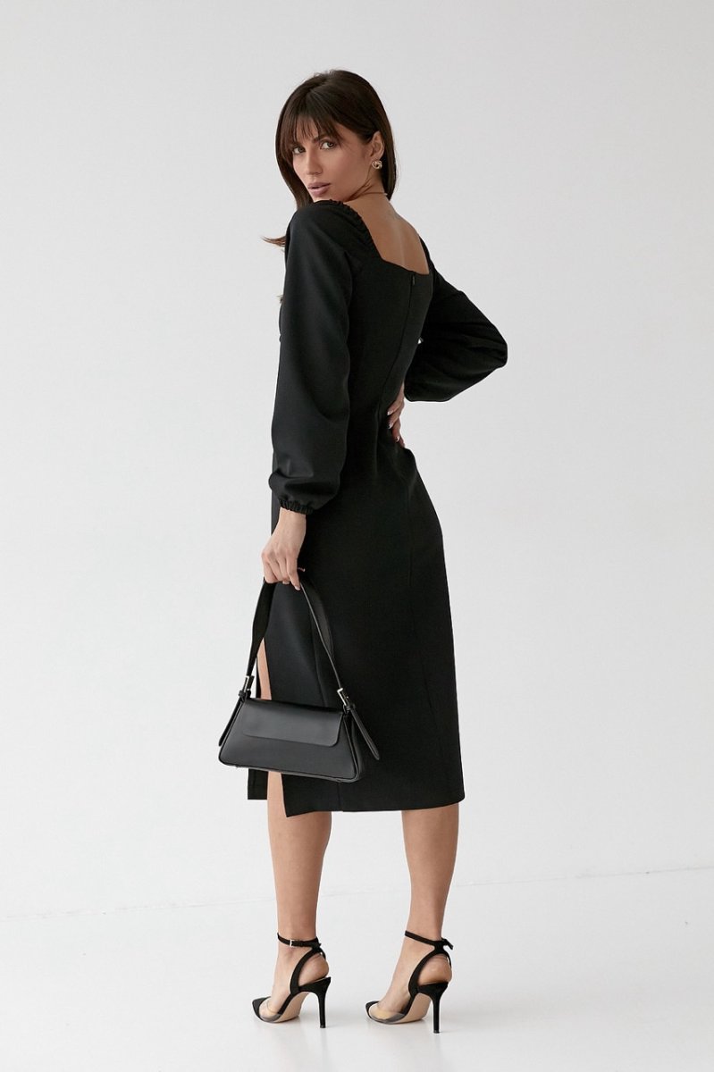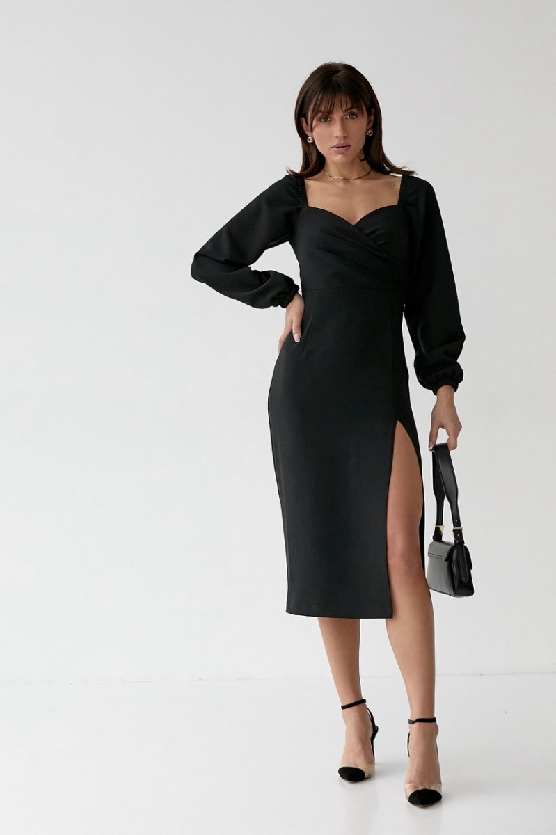 Платье миди с разрезом. Полочка отрезная, линия талии завышена. Лиф на запах со складками. Изделие выполнено с талиевыми выточками. Переднее полотнище юбки с высоким разрезом на левой ноге. В среднем шве спинки застежка на скрытую тесьму молнию. Рукава длинные, собранные внизу на резинку. Верхняя часть рукава собрана на резинку, которая используется как бретель.