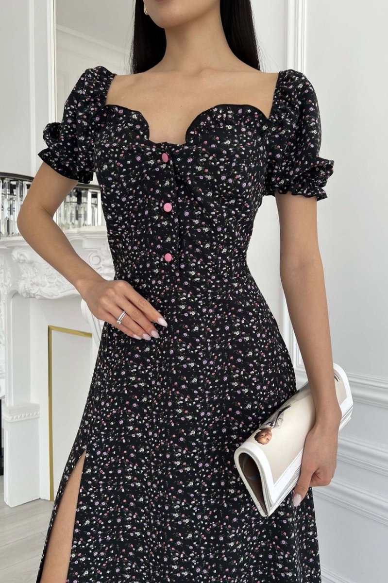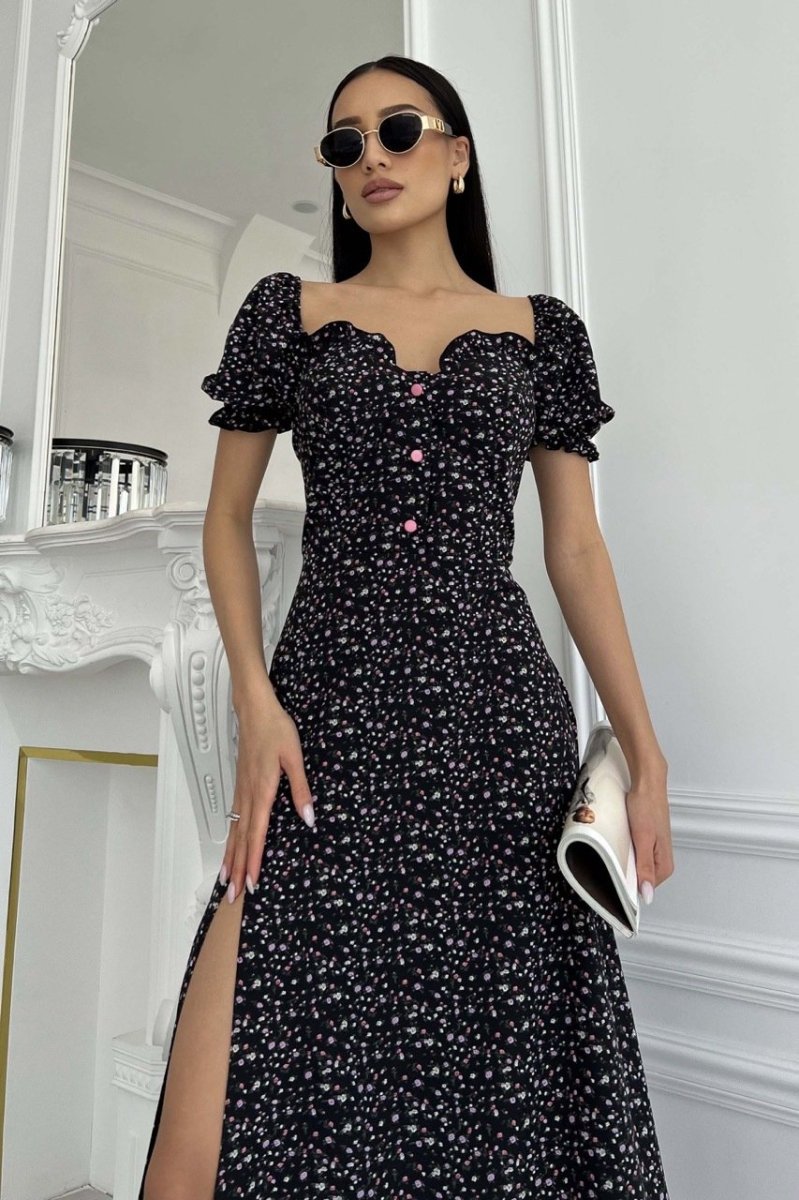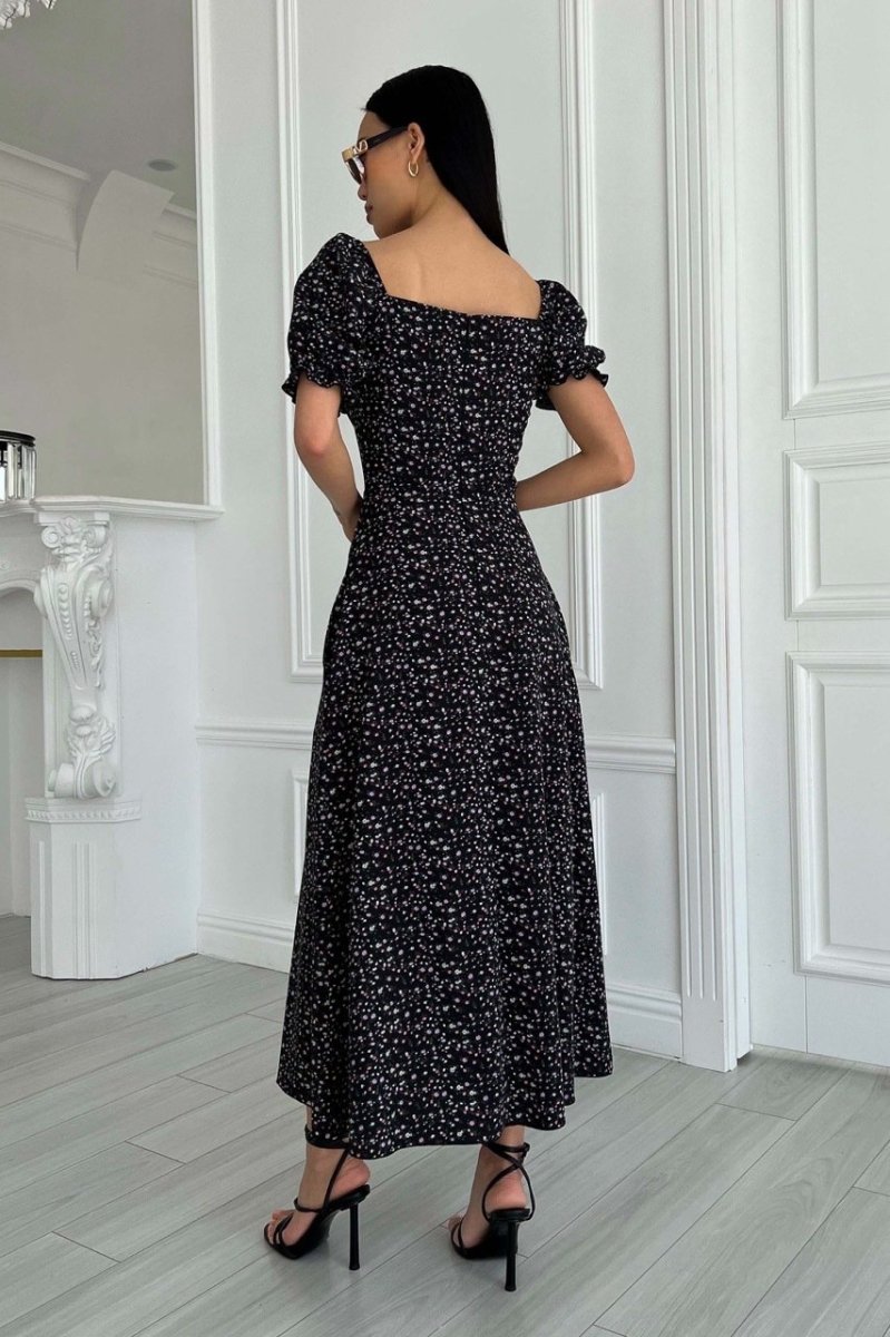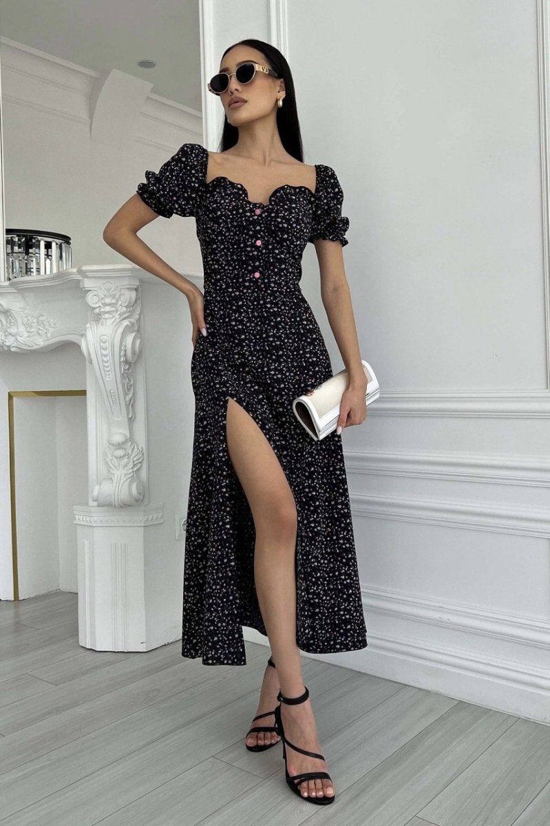 Летнее платье-миди романтического кроя. Выполнена из струящейся принтованной ткани в мелкий цветочный принт. Модель украшает фигурный вырез и оборку по лифу, что подчеркивает зону декольте. Короткий рукав-фонарик с эластичной манжетой. Длинная юбка а-силуэта подчеркивает линию талии. Со стороны предусмотрен небольшой разрез.