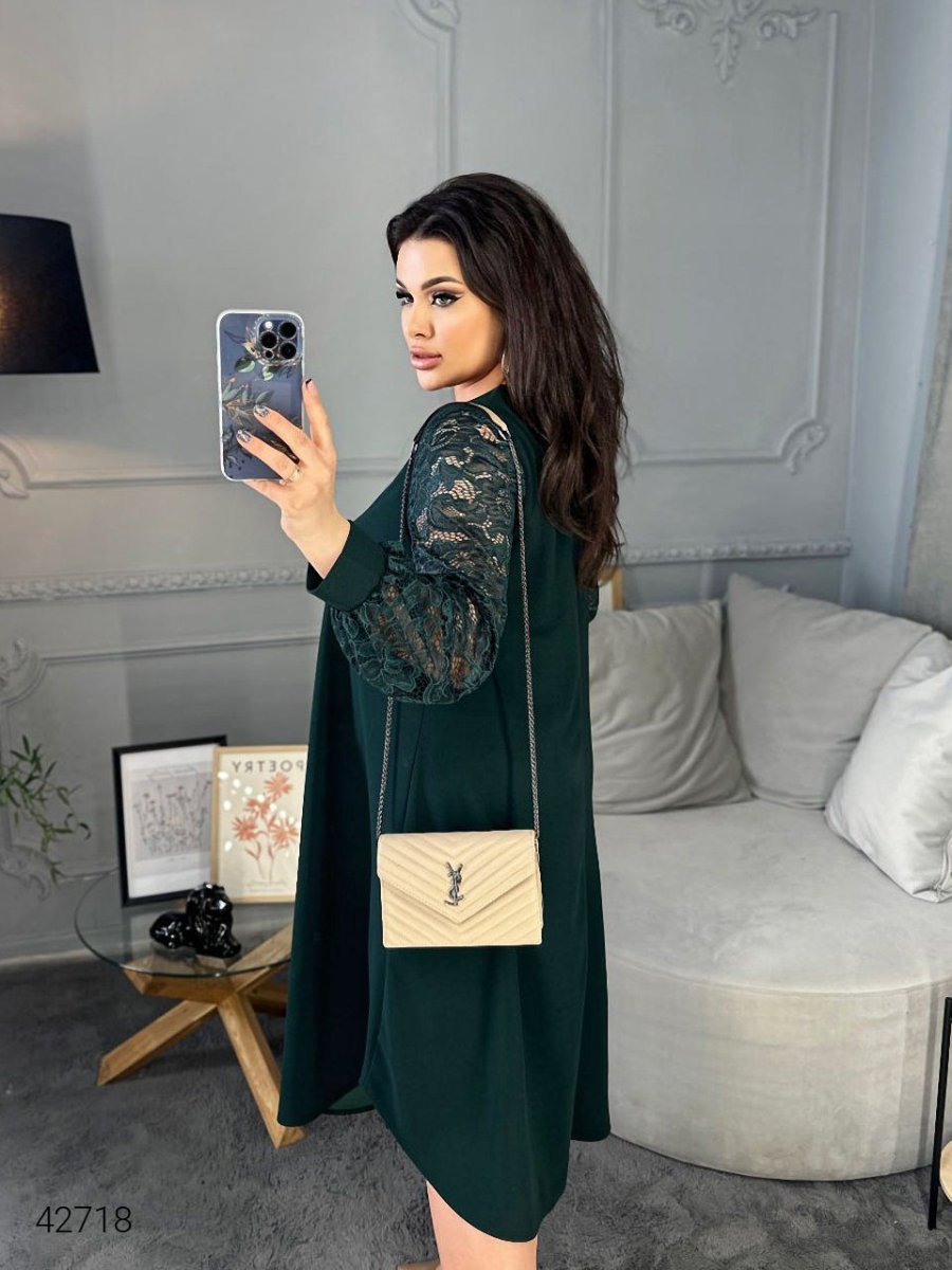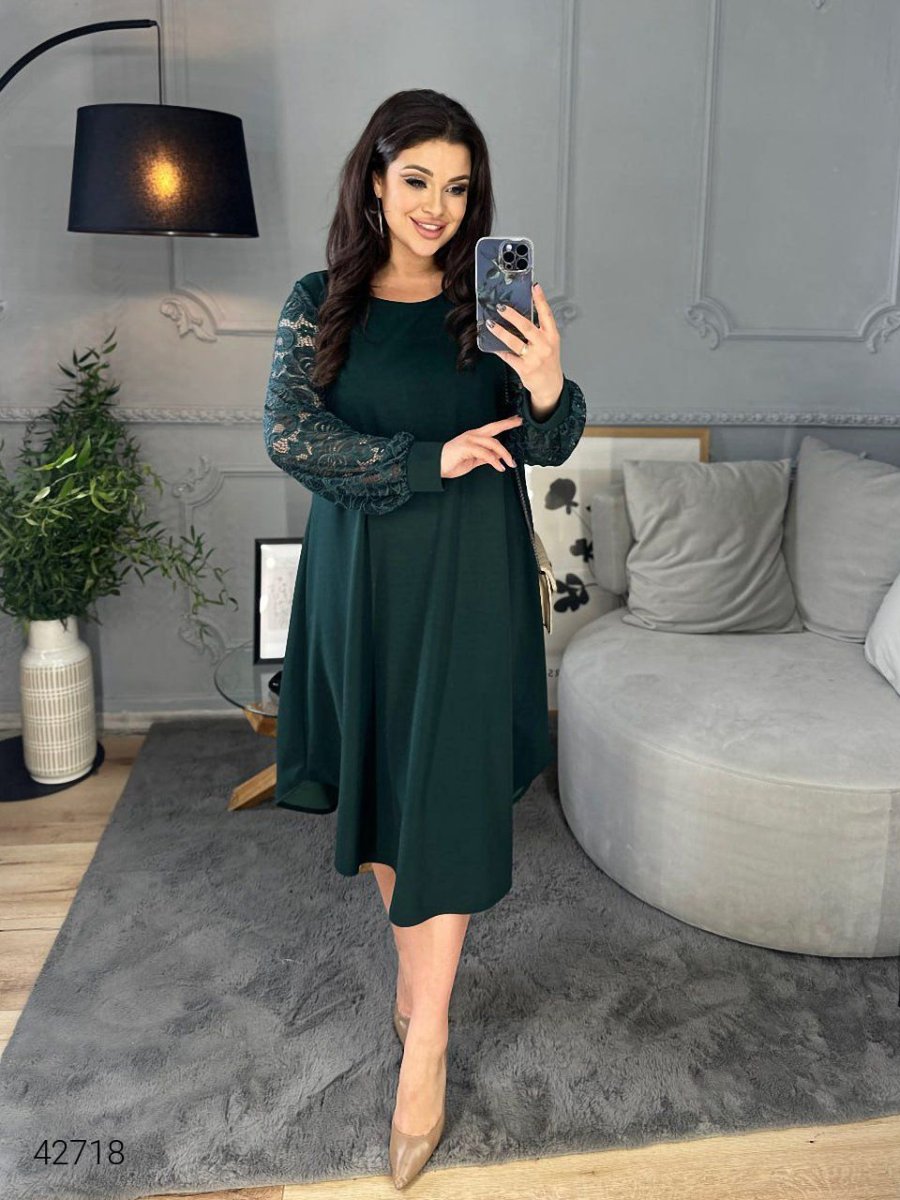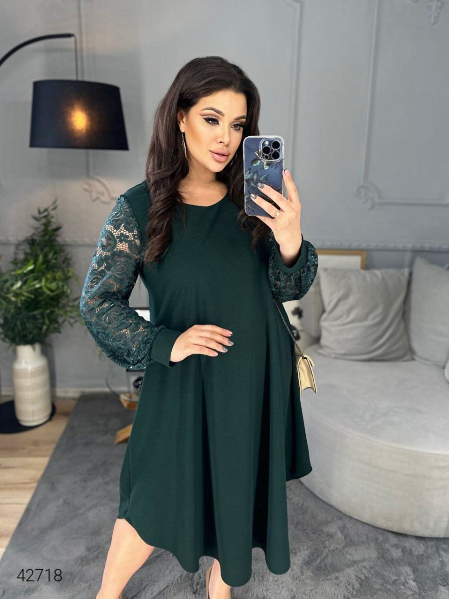 Платье для полных с рукавами из гипюра 42718 зеленый
