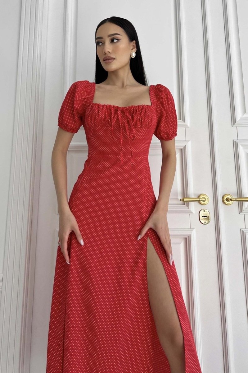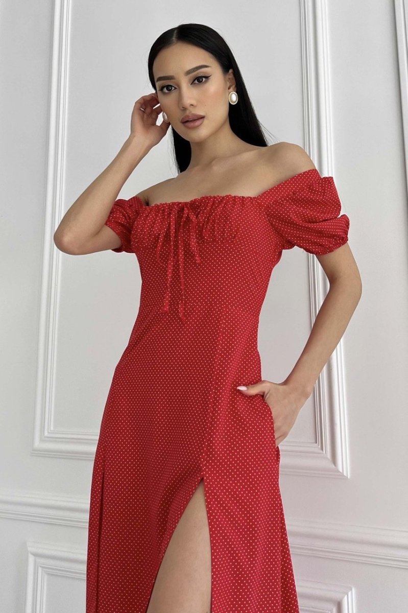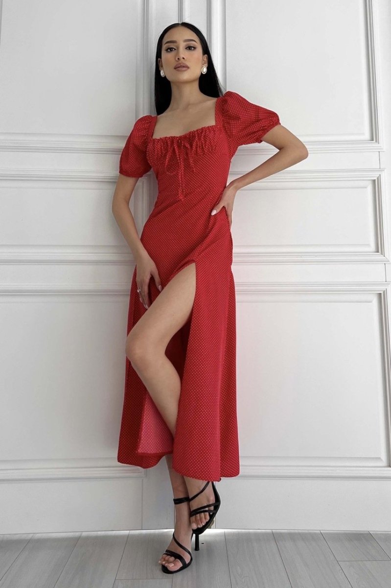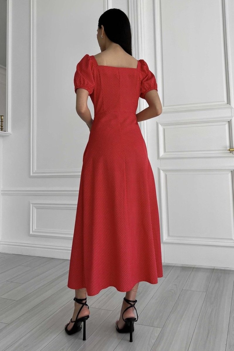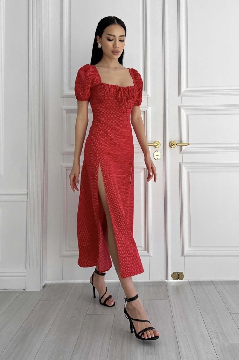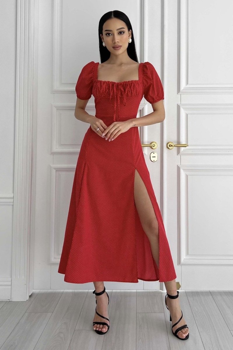 Летнее платье-миди романтического кроя. Выполнена из принтованной ткани (горошок), струящейся. Модель украшает фигурный вырез и драпировку по лифу, что подчеркивает зону декольте. Короткий рукав-фонарик с эластичной манжетой. Длинная юбка а-силуэта подчеркивает линию талии. На юбке предусмотрено два разреза.