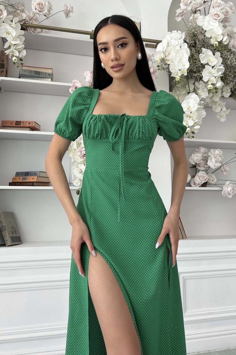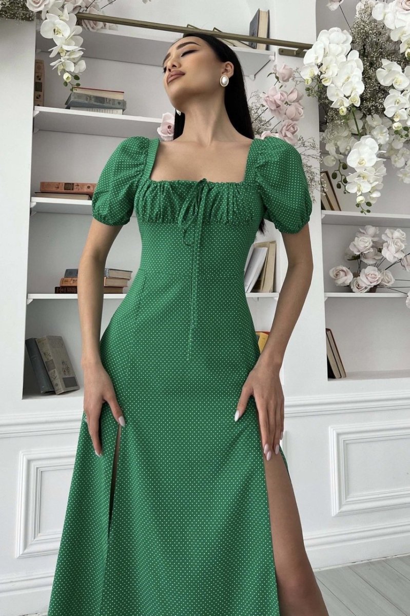 Летнее платье-миди романтического кроя. Выполнена из принтованной ткани (горошок), струящейся. Модель украшает фигурный вырез и драпировку по лифу, что подчеркивает зону декольте. Короткий рукав-фонарик с эластичной манжетой. Длинная юбка а-силуэта подчеркивает линию талии. На юбке предусмотрено два разреза.