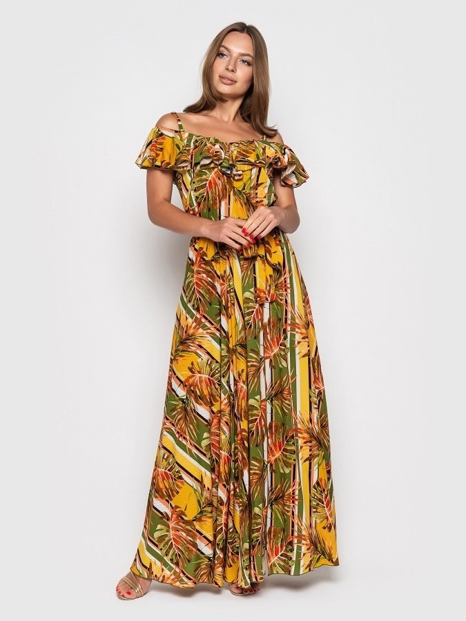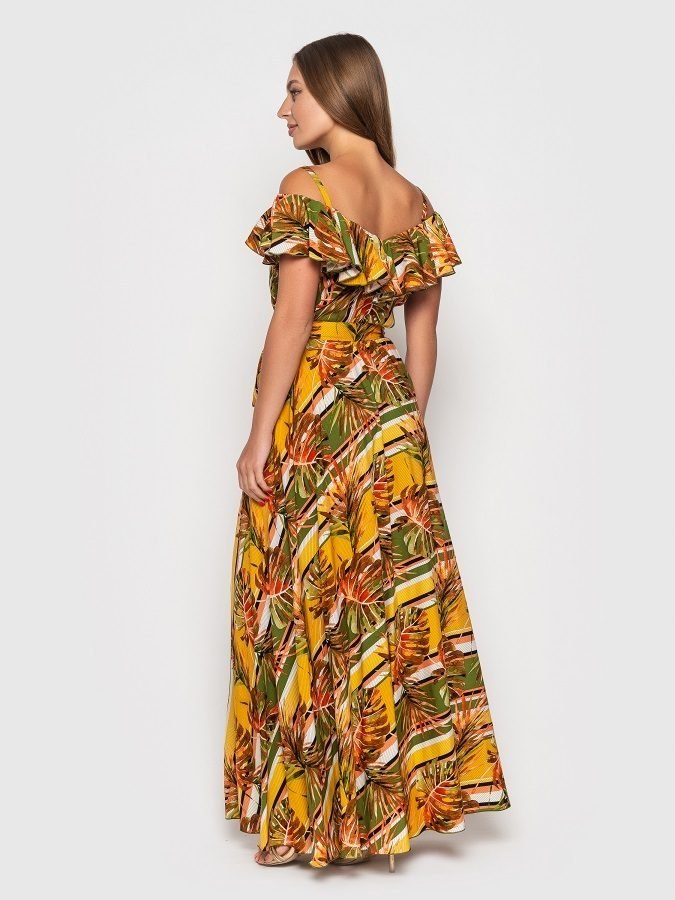 Эффектное платье длины макси с кокетливой оборкой по воротнику. Модель дополнена съемными регулируемыми бретелями. По талии проходит эластичная вставка. Вдоль линии бедра - разрез. В комплекте съемный тканевый пояс в тон платья.