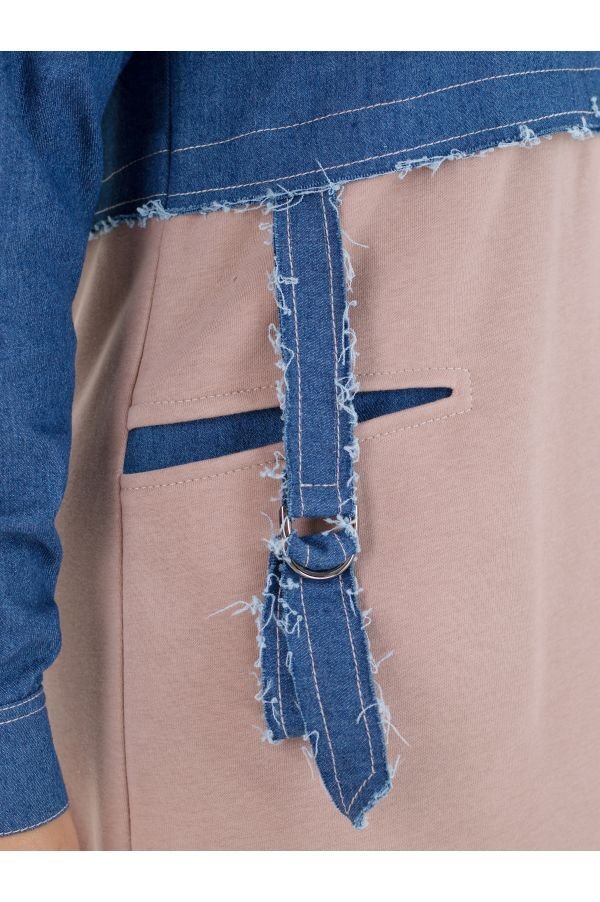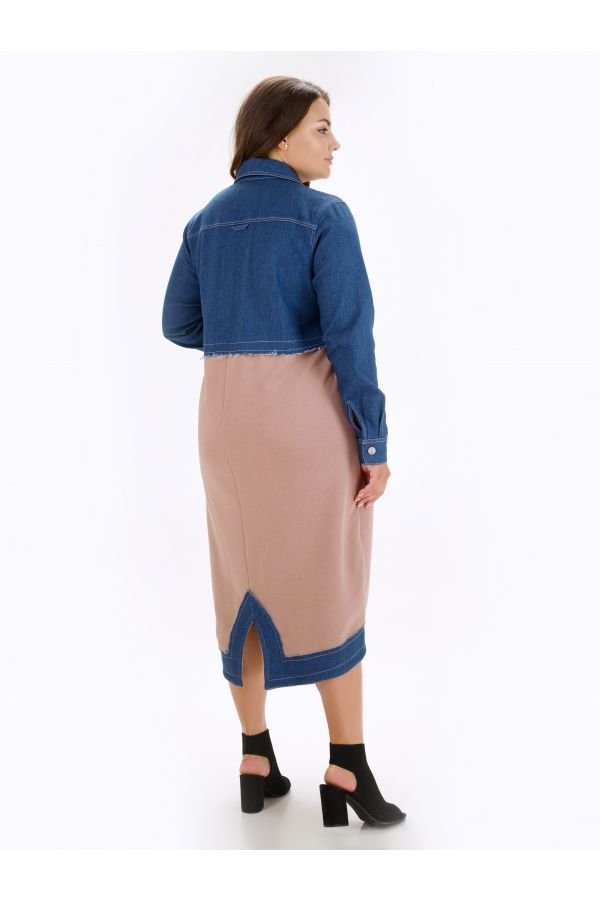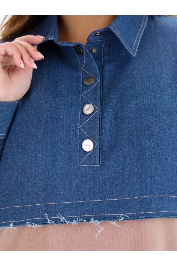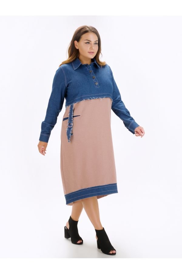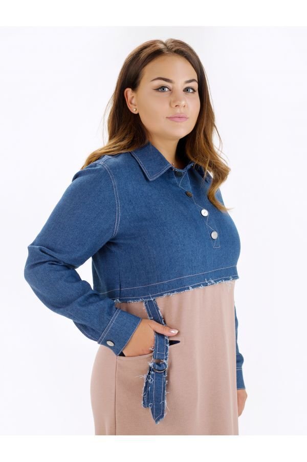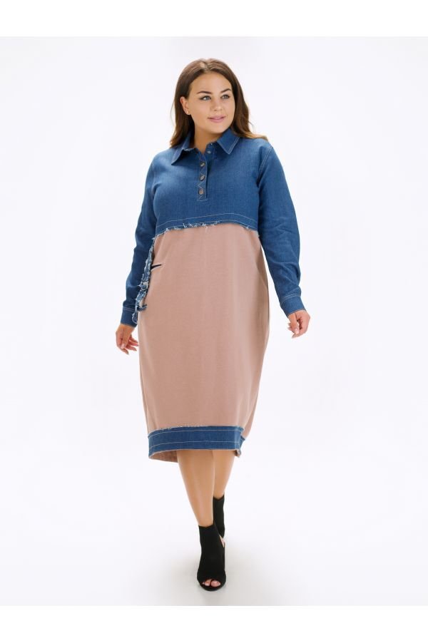 Оригинальное женское платье Эвия свободного, комфортного силуэта. Создано из комбинации двух типов натуральной ткани. Верх платья - рубашечного типа, застегивается на кнопки по планочке. Манжеты рукавов на кнопках. По низу полоса из джинсовой ткани, сзади разрез. Спинка слегка удлинена. На полочке горизонтальный прорезной карман, декорирован пояском с регулировкой.