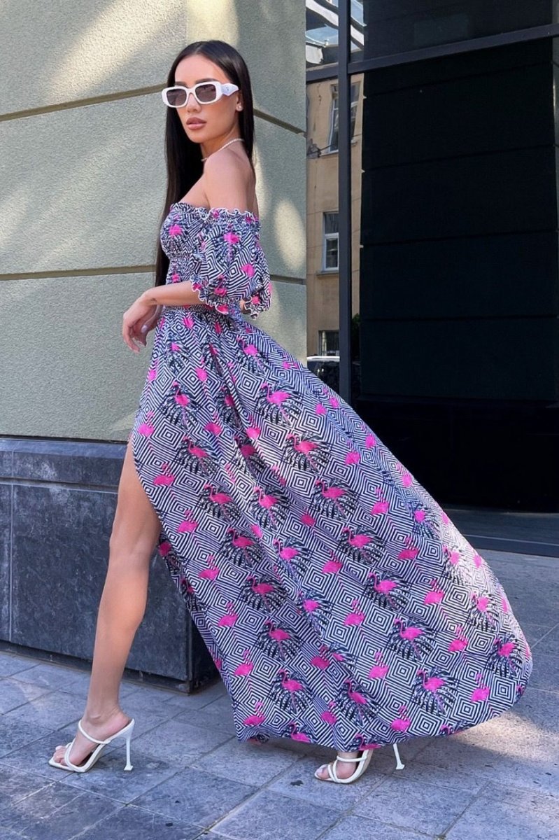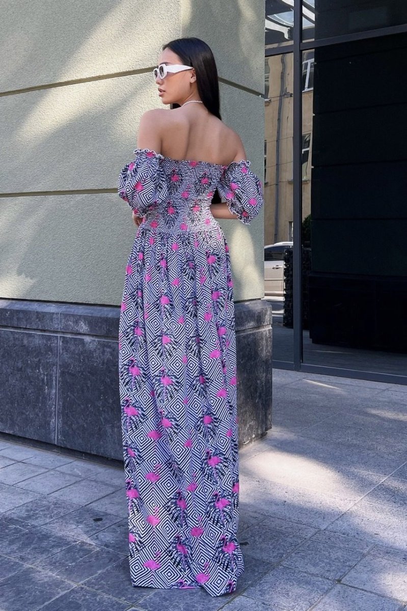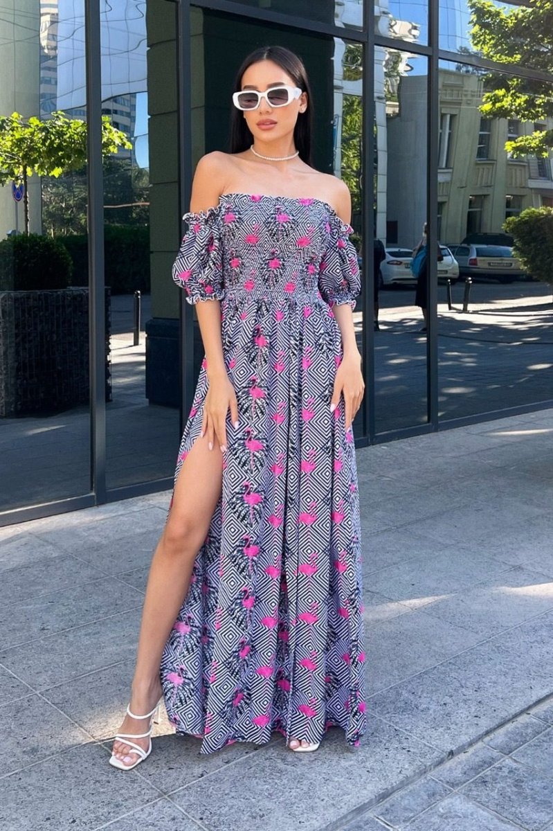 Нежность ассоциируется исключительно с легкими тканями и воздушным кроем – чрезвычайно эффектное и сексуальное летнее платье в пол из принтованного штапеля – то, что нужно на жаркое лето. Длинная юбка в пол визуально вытянет силуэт, придаст Вам шарм и привлекательность. Интересно оформленный лиф на резинках платья будут притягивать взгляды противоположного пола. А разрез по юбке привлекут внимание к Вашим ножкам! Безусловно, в этом платье Вы будете королевой вечера.