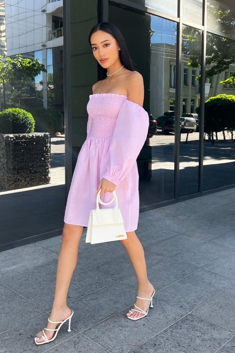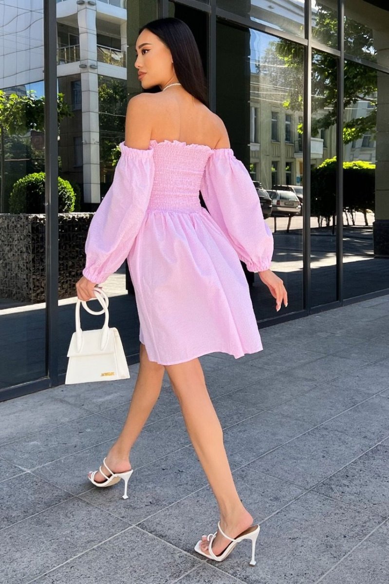Мини-платье с завышенной талией, эластичным лифом и открытой линией плеч будет особенно актуально в жаркие дни. Легкая однотонная модель с рукавами-фонариками, сшитая из дышащего тонкого материала выполнена в яркой палитре летнего цвета.