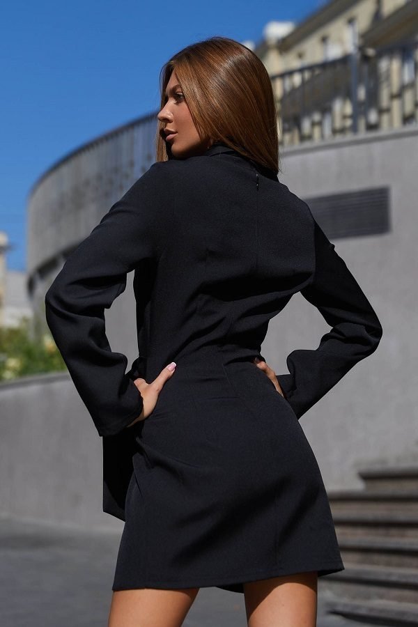 Платье классического фасона из костюмной ткани. Верх изделия пиджачного типа с английским воротником и длинным рукавом. Драпированая двойная юбка в запах, которая завязывается на красивый узел. Сзади платье застегивается на потайную молнию.