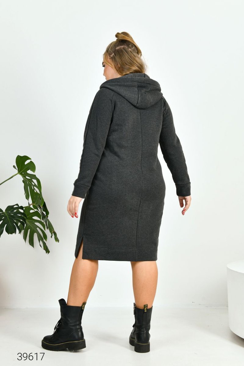 Платье-худи больших размеров. Теплое платье в спортивном стиле с капюшоном, в кулиску протянут шнур из основного материала. На передней полочке карман "кенгуру". Снизу по бокам небольшие разрезы.