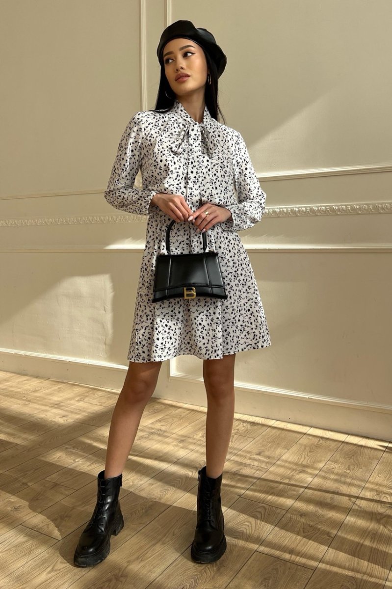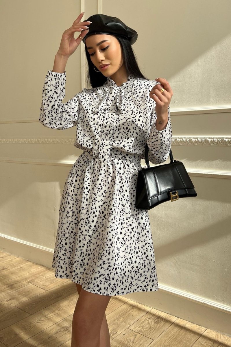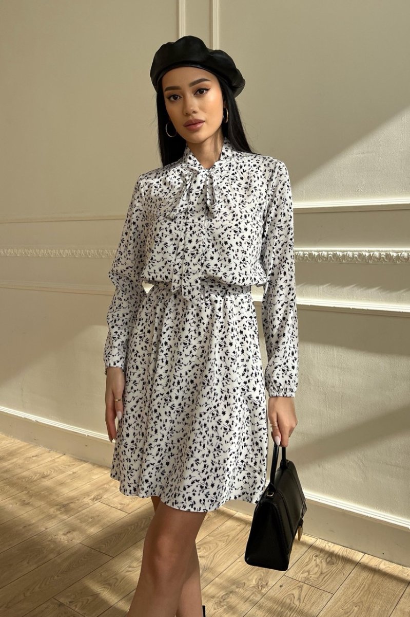 Свободный длинный рукав с эластичной манжетой, пояс в цвет платья, воротник-аскот с завязками, короткая юбка – помогут создать неповторимый образ на каждый день.